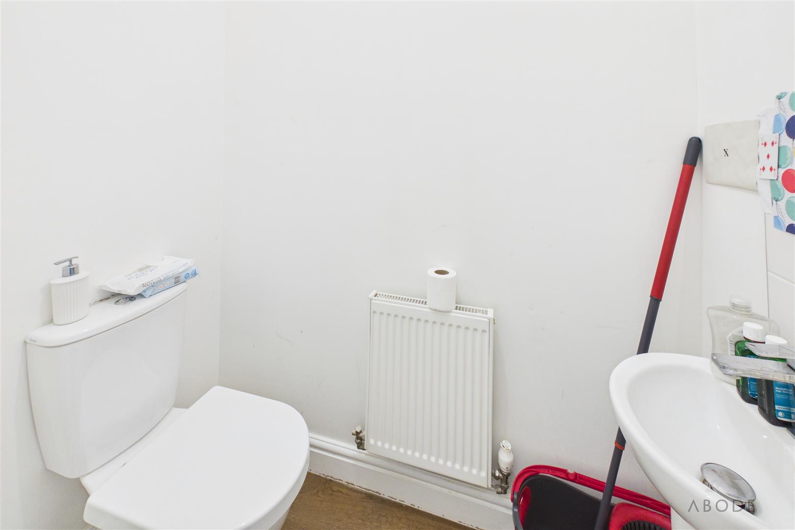 Low flush wc, wash hand basin and radiator.