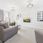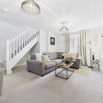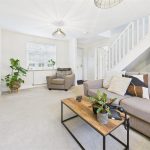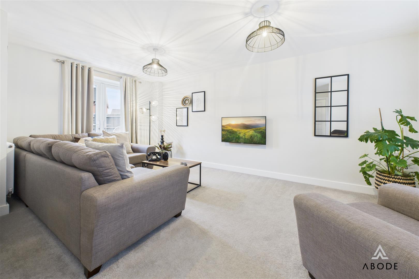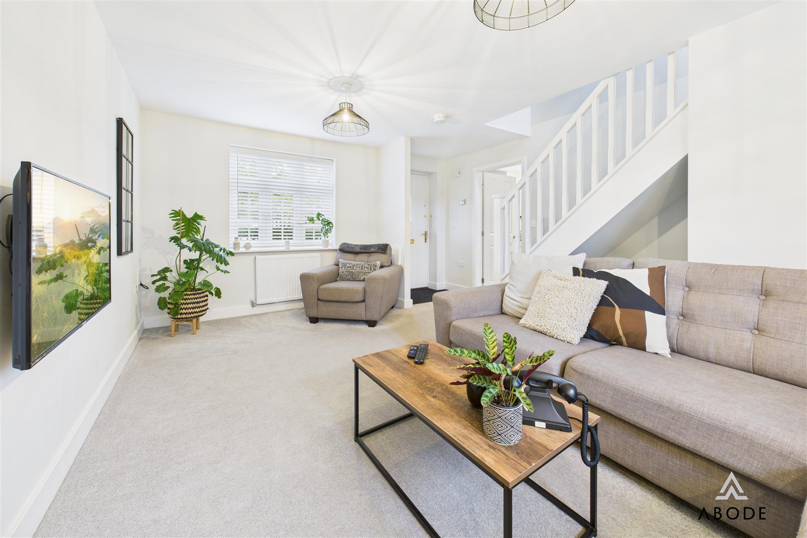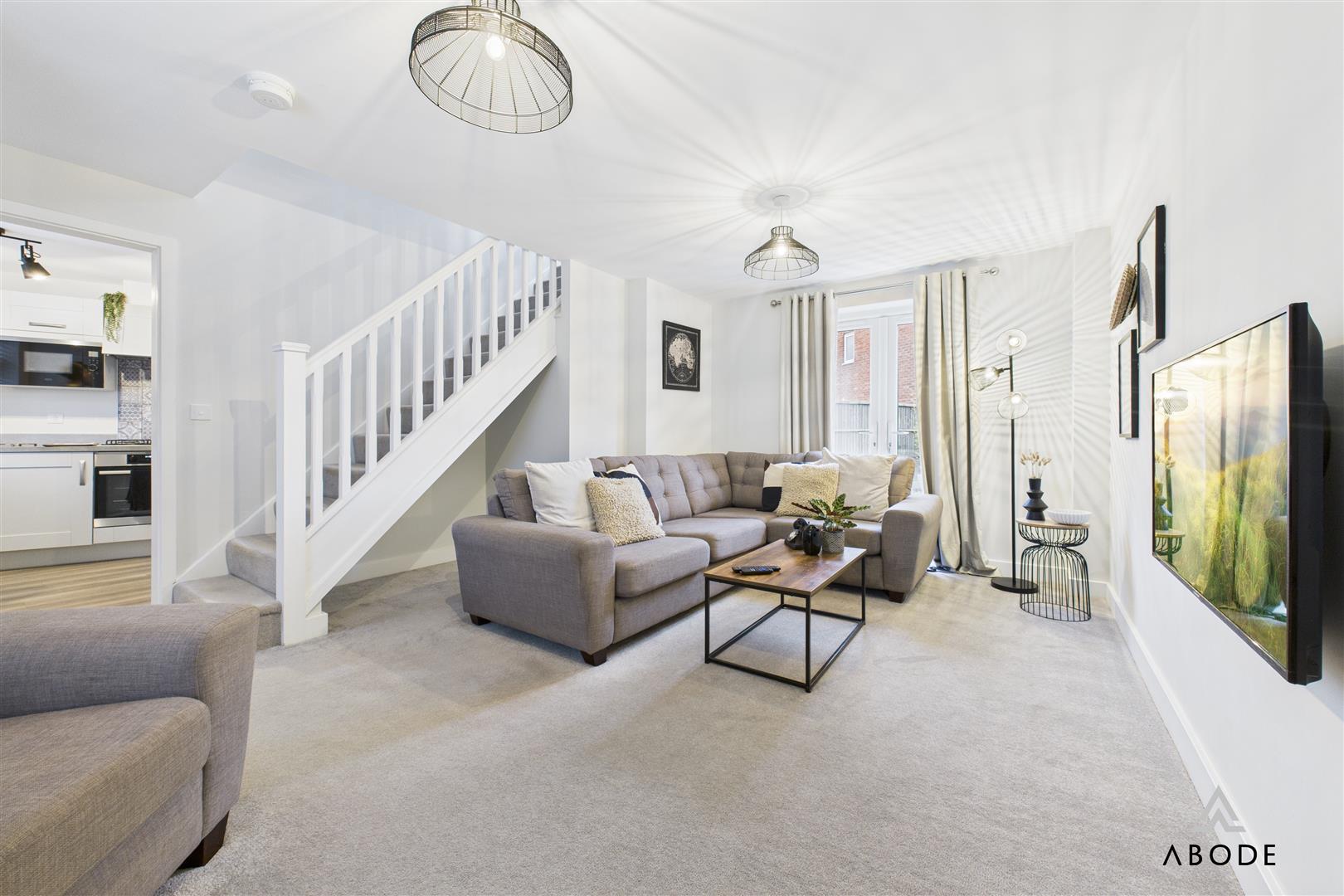 A spacious and comfortable living area featuring a uPVC double-glazed window to the front elevation and uPVC double-glazed French doors opening onto the rear patio. The lounge includes two central heating radiators, a TV aerial point, multiple power sockets, HDMI and Ethernet connections, a fibre broadband connection point, thermostat, smoke alarm, doorbell chime, and the electrical consumer unit. A staircase rises to the first-floor landing.