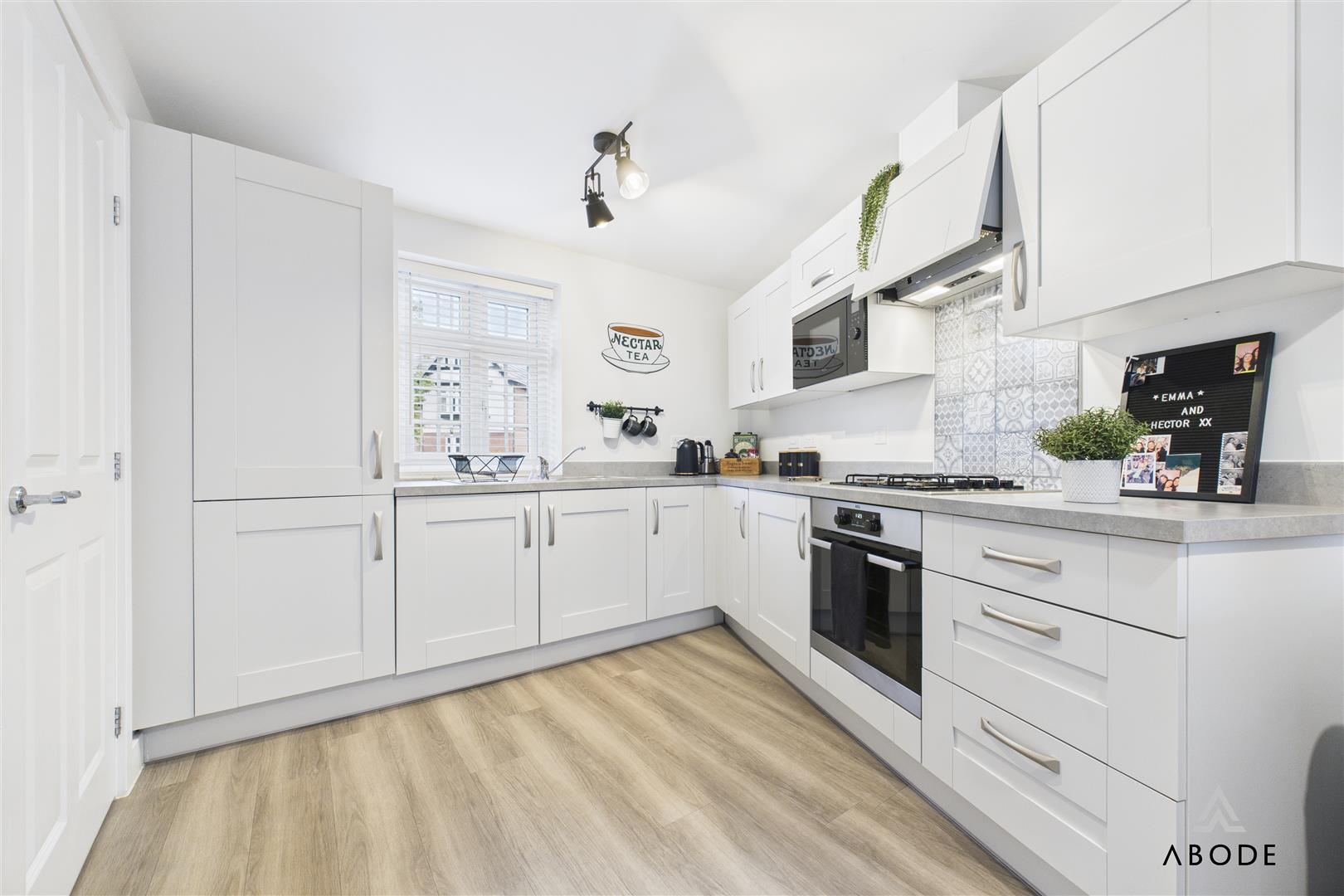A bright and welcoming space with a uPVC double-glazed window to the front elevation. The kitchen features a range of matching high- and low-level cupboards and drawers with contrasting work surfaces. Integrated appliances include a stainless steel four-ring gas hob with extractor hood, built-in oven and grill, microwave, fridge freezer, washing machine, and a one-and-a-half bowl stainless steel sink with drainer and mixer tap. There is a central heating radiator and an internal door leading to: