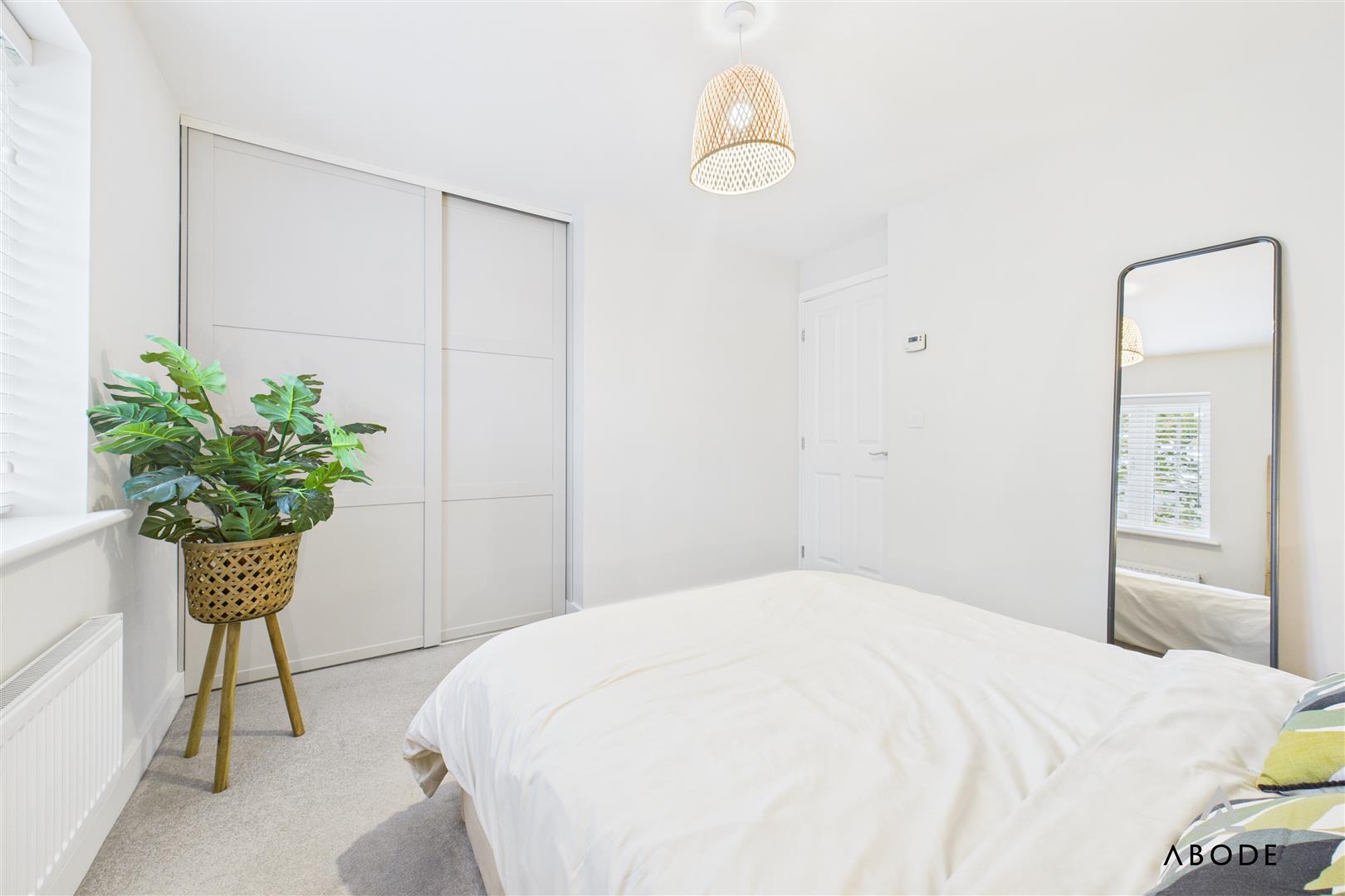 A generously sized double bedroom with a uPVC double-glazed window to the front elevation, central heating radiator, and fitted wardrobes with sliding doors offering hanging and shelving space.