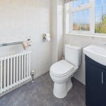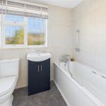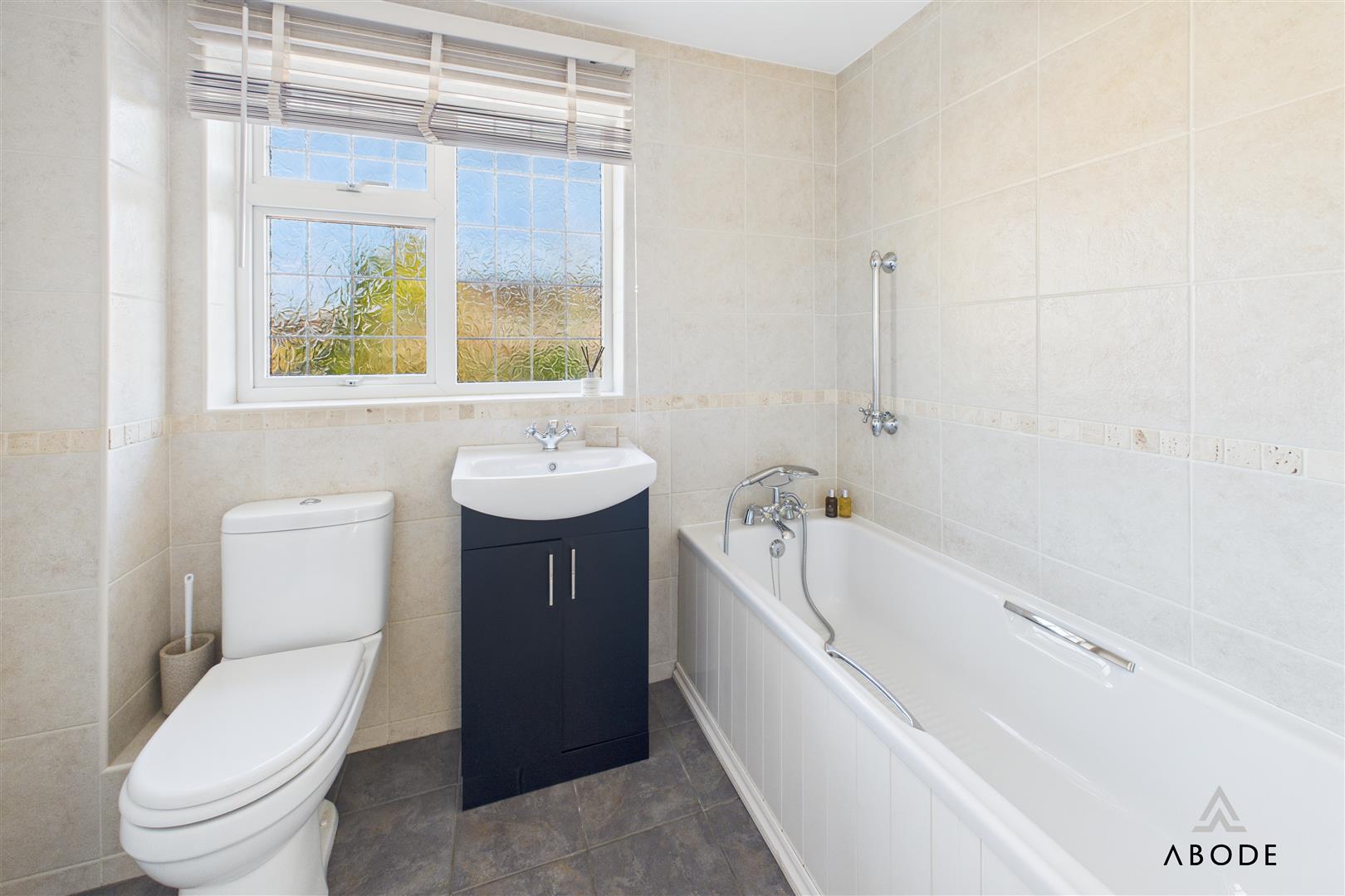 Panel enclosed bath with shower attachment tap, low flush wc, vanity sink unit with wash hand basin and storage cupboard under. Cast iron style radiator, fully tiled walls and floor and a upvc double glazed window.