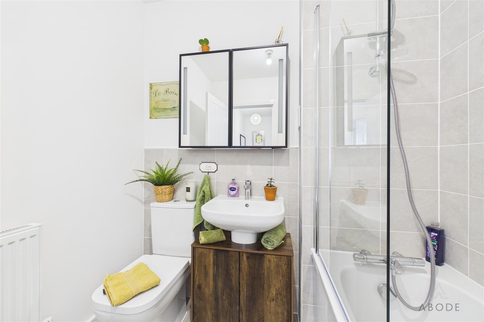 Comprising a three-piece suite including a low-level WC, pedestal wash hand basin with mixer tap, and a double shower cubicle with shower over. Finished with complementary wall tiling, a central heating radiator, extractor fan, shaving point, and a UPVC double-glazed frosted window to the front elevation.