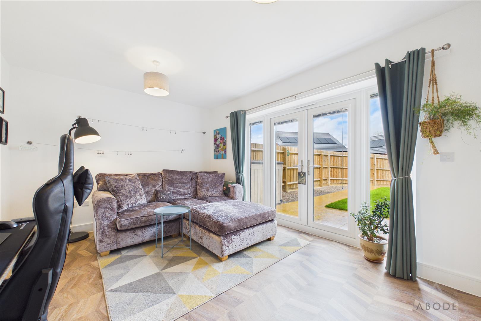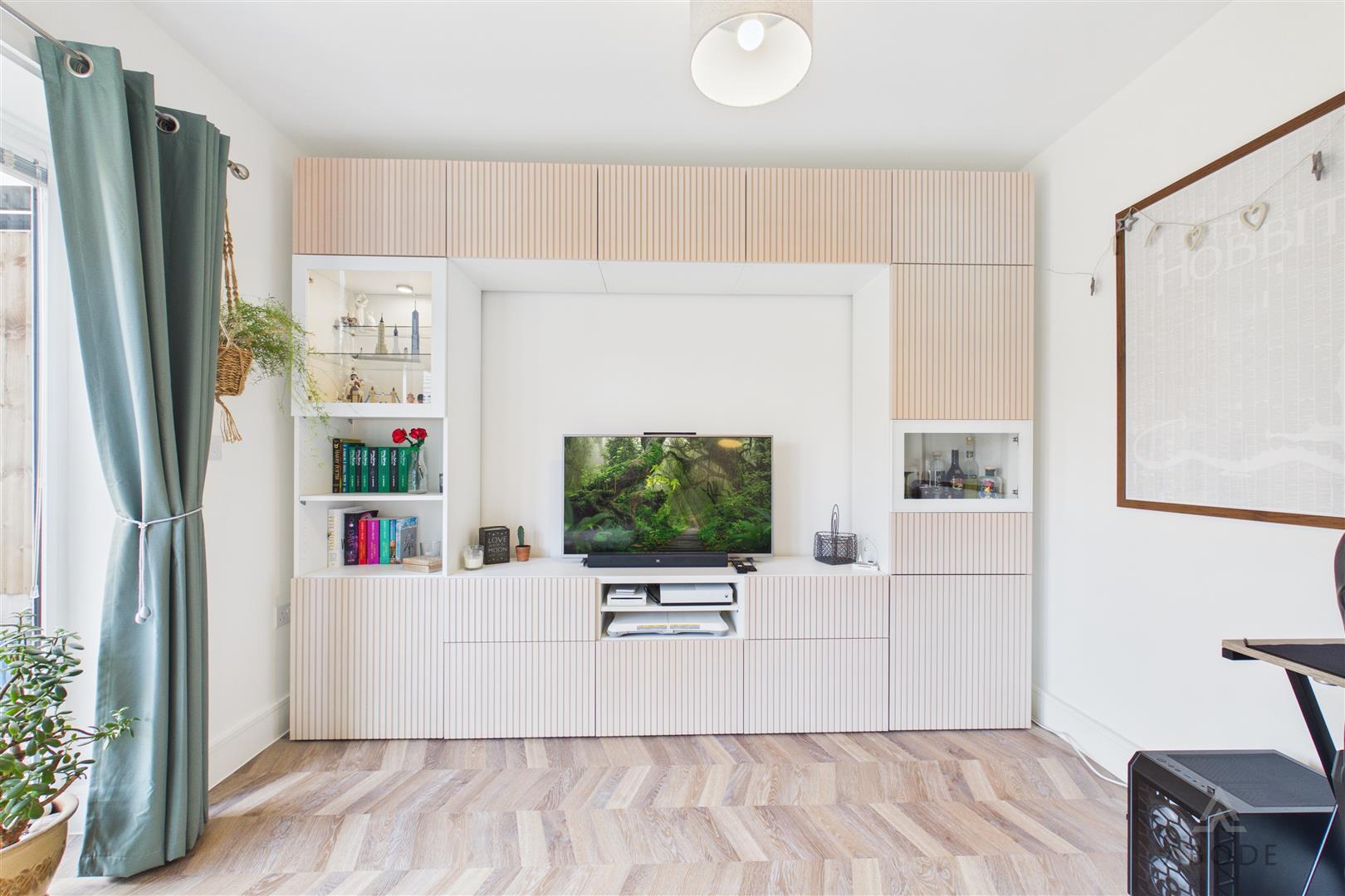 A bright and comfortable living space with UPVC double-glazed French doors and adjoining windows opening onto the rear garden. The room includes a central heating radiator, telephone point, TV aerial point.