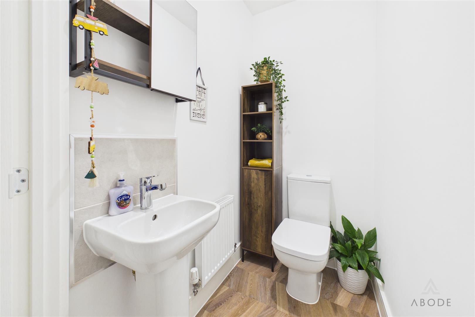 Fitted with a low-level WC with continental flush, pedestal wash hand basin with mixer tap and tiled splashback. Additional features include a central heating radiator and extractor fan.