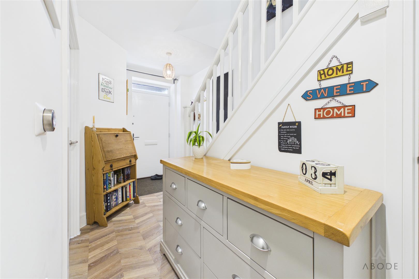A welcoming entrance hall is accessed via a composite front door, leading to a staircase rising to the first-floor landing. The hallway benefits from a central heating radiator with thermostat control and a useful under-stairs storage cupboard housing the electrical consumer unit and fibre connection point. Internal doors provide access to: