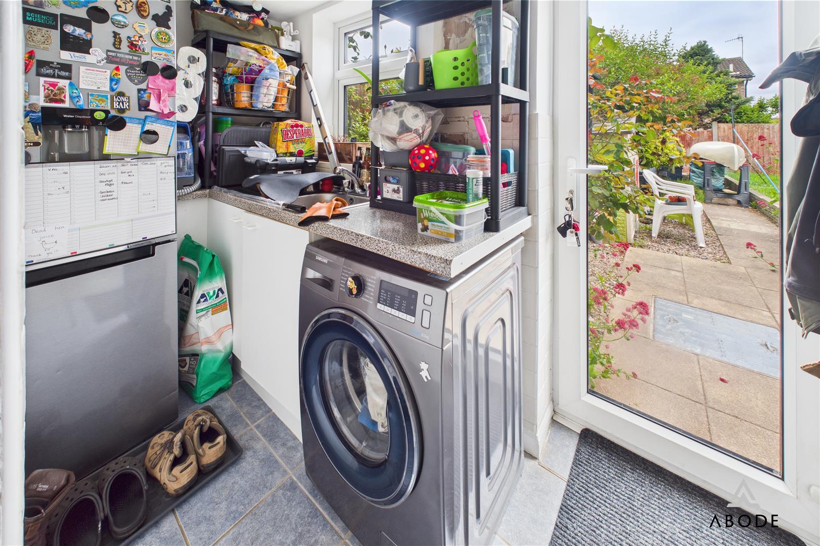 Fitted cupboard, work surfaces, sink and drainer unit, plumbing and space for a washing machine, upvc double glazed window and door to the garden, door to the cloakroom and garage.