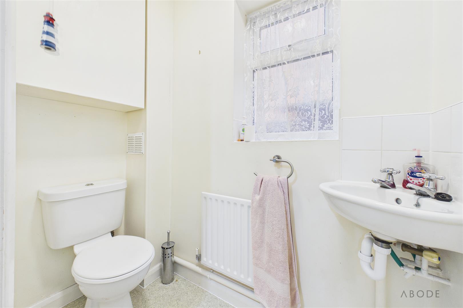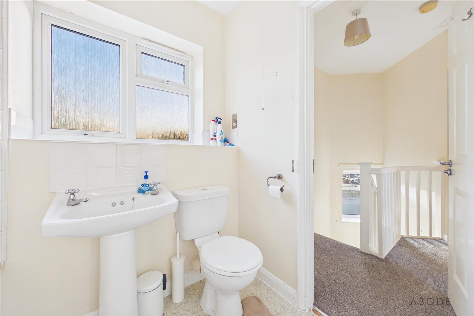 Fitted with a low-level WC and a floating corner wash hand basin with tiled splashback. A UPVC double glazed frosted window to the side elevation provides natural light, and there is a central heating radiator.