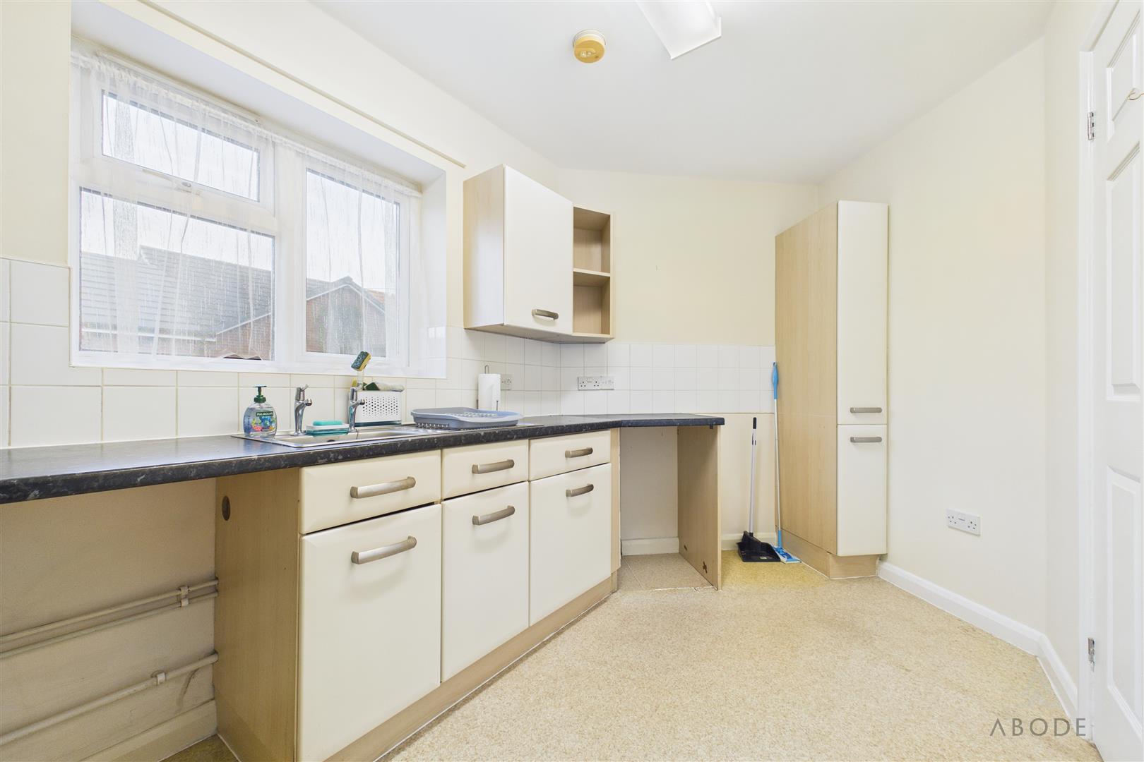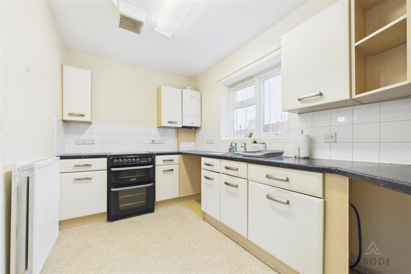 Appointed with a range of matching base and eye-level storage cupboards and drawers with roll-top preparation work surfaces and complementary tiling. Integrated features include a stainless steel sink and drainer and housing for the Worcester Bosch gas central heating boiler. There is a freestanding four-ring gas hob with oven and grill, plumbing and space for under-counter white goods, a central heating radiator, and a UPVC double glazed window to the rear elevation.