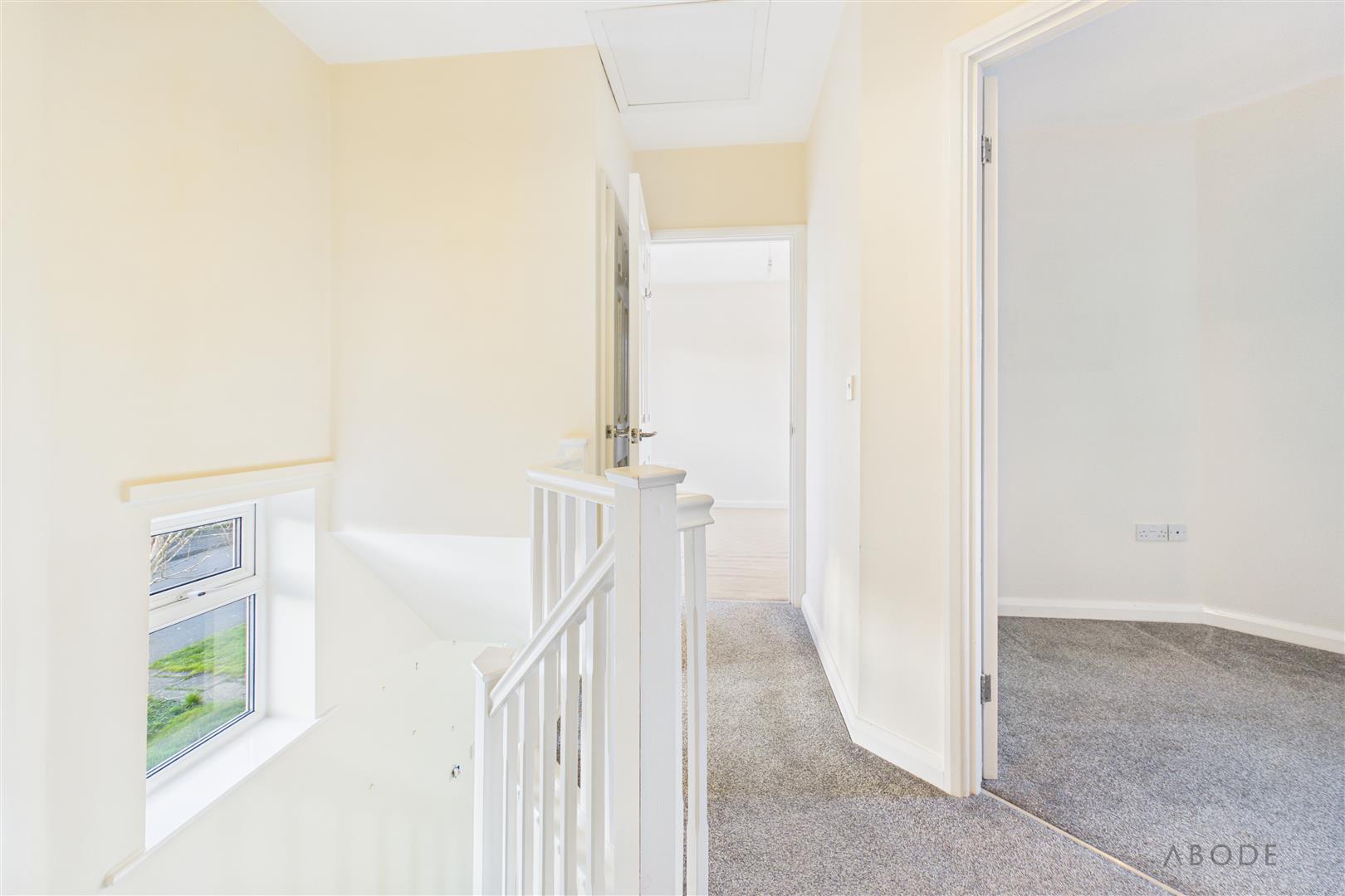 With smoke alarm, useful overstairs storage cupboard with shelving, and internal doors leading to: