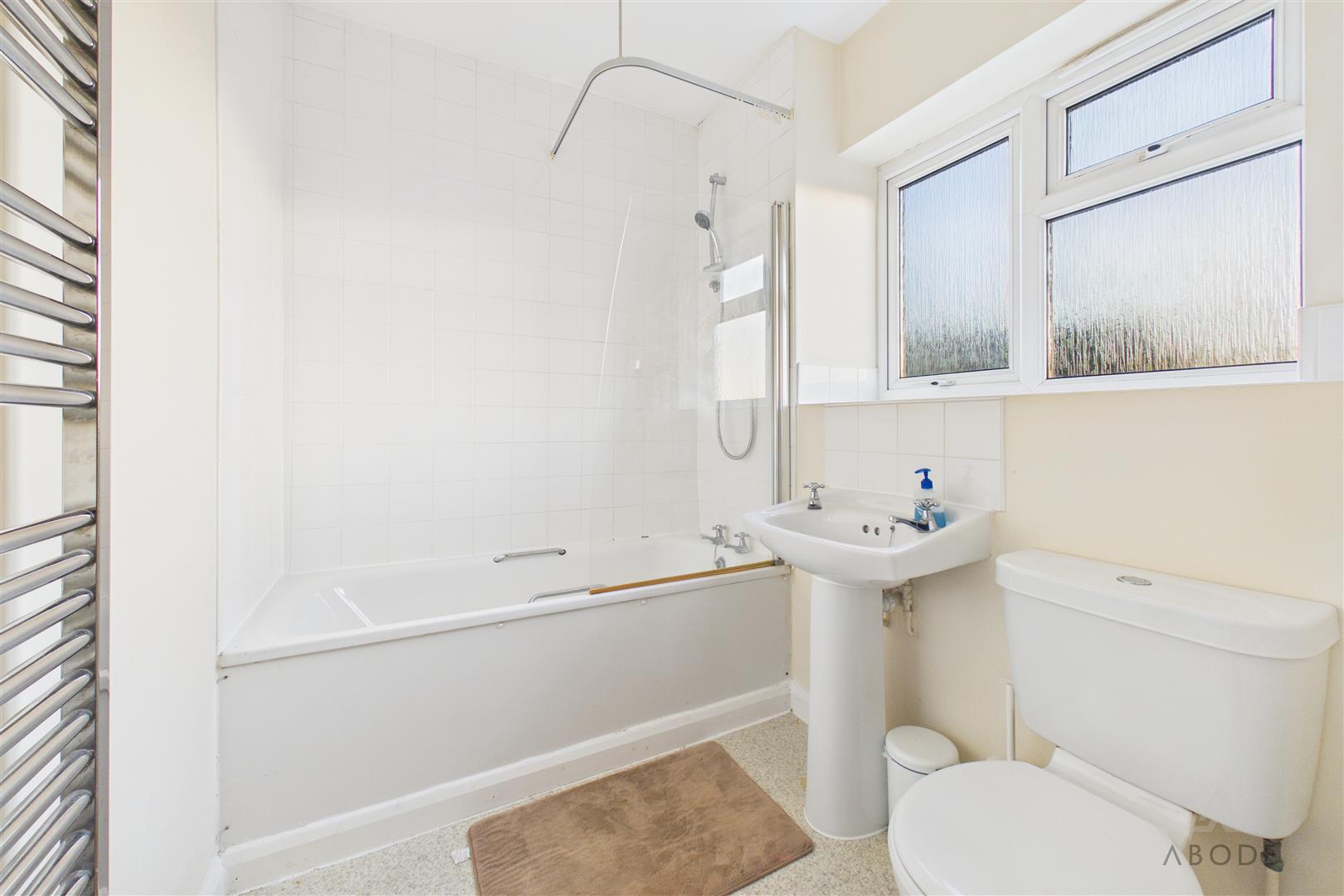 Fitted with a three-piece suite comprising a low-level WC with continental flush, pedestal wash hand basin with tiled splashback, and panelled bath with glass screen and electric shower over. Complementary wall tiling, chrome heated towel radiator, shaver point, extractor fan, and a UPVC double glazed frosted window to the front elevation complete the room.