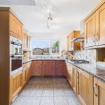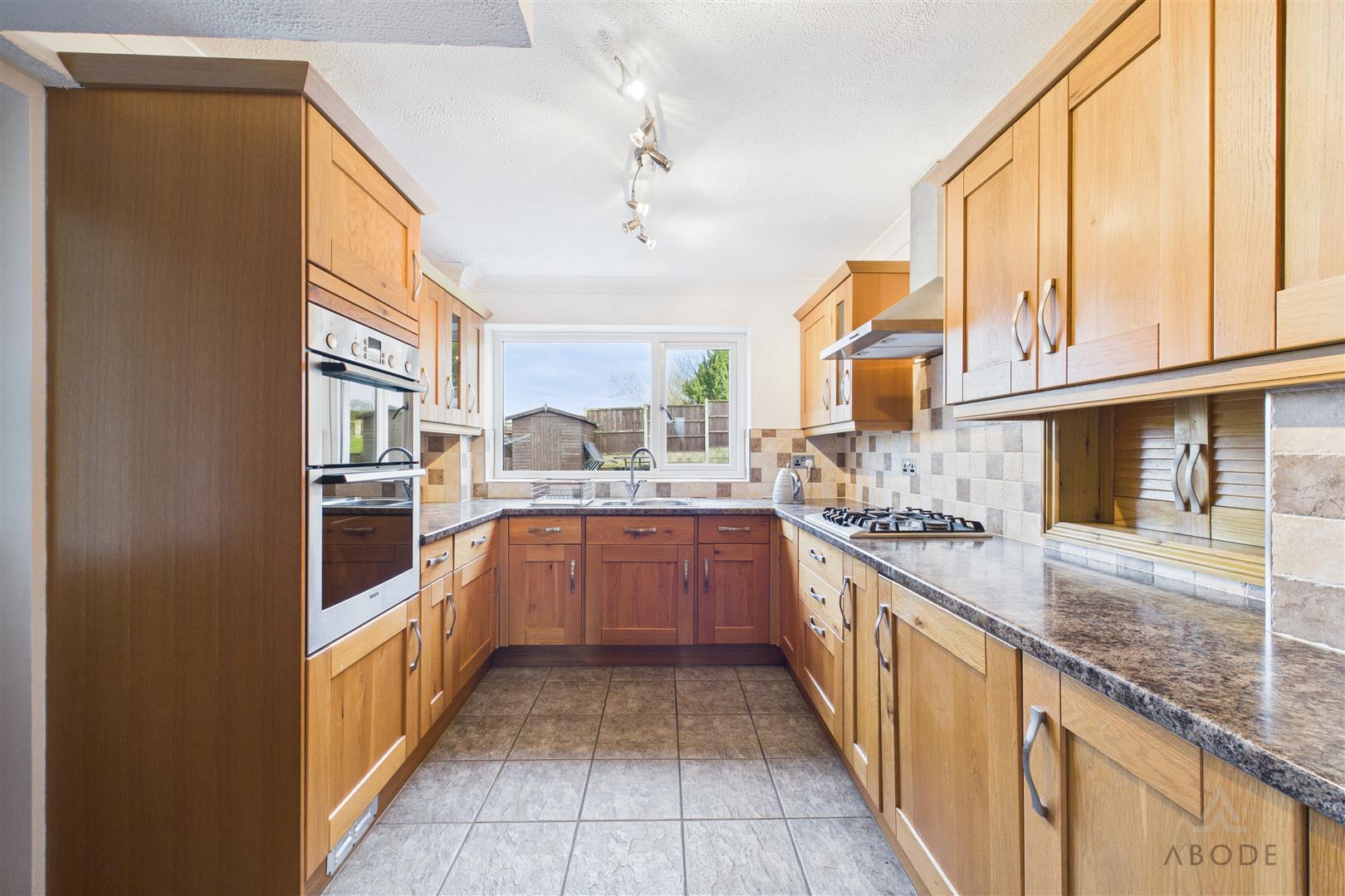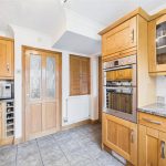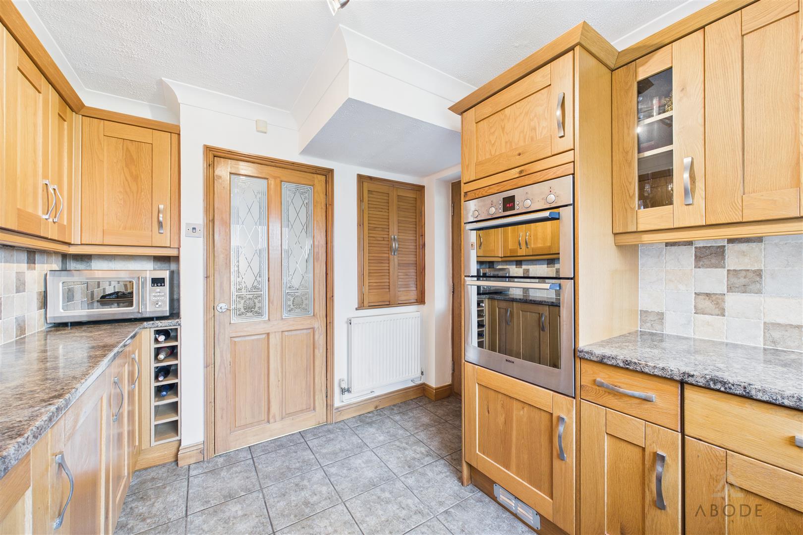 Base and eye level units with complimentary worktops, one and a half bowl stainless steel sink with draining board, integrated fridge freezer, cooker, grill and gas hob with extractor hood over. Tiled flooring and partially tiled walls, UPVC double glazed window to the rear elevation overlooking the garden, central heating radiator, wine rack, storage cupboard.