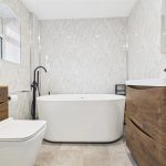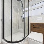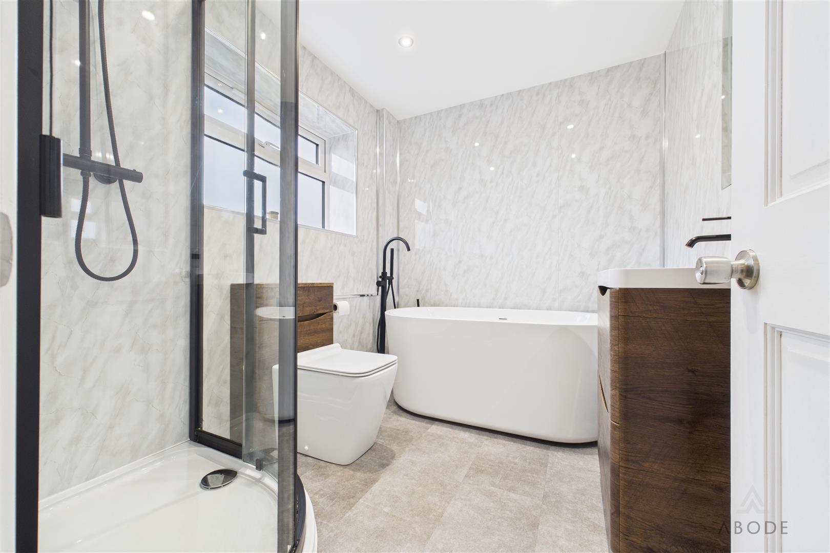 Modern suite comprising;- WC, wash hand basin with drawers below, corner shower cubicle with waterfall and hand held shower and bath. Towel radiator, light up mirror, spot lighting and UPVC double glazed window to the side elevation.