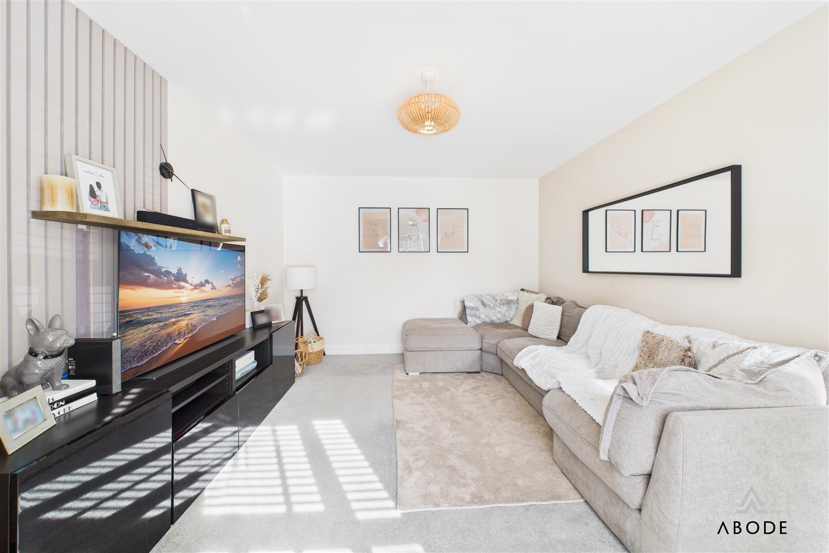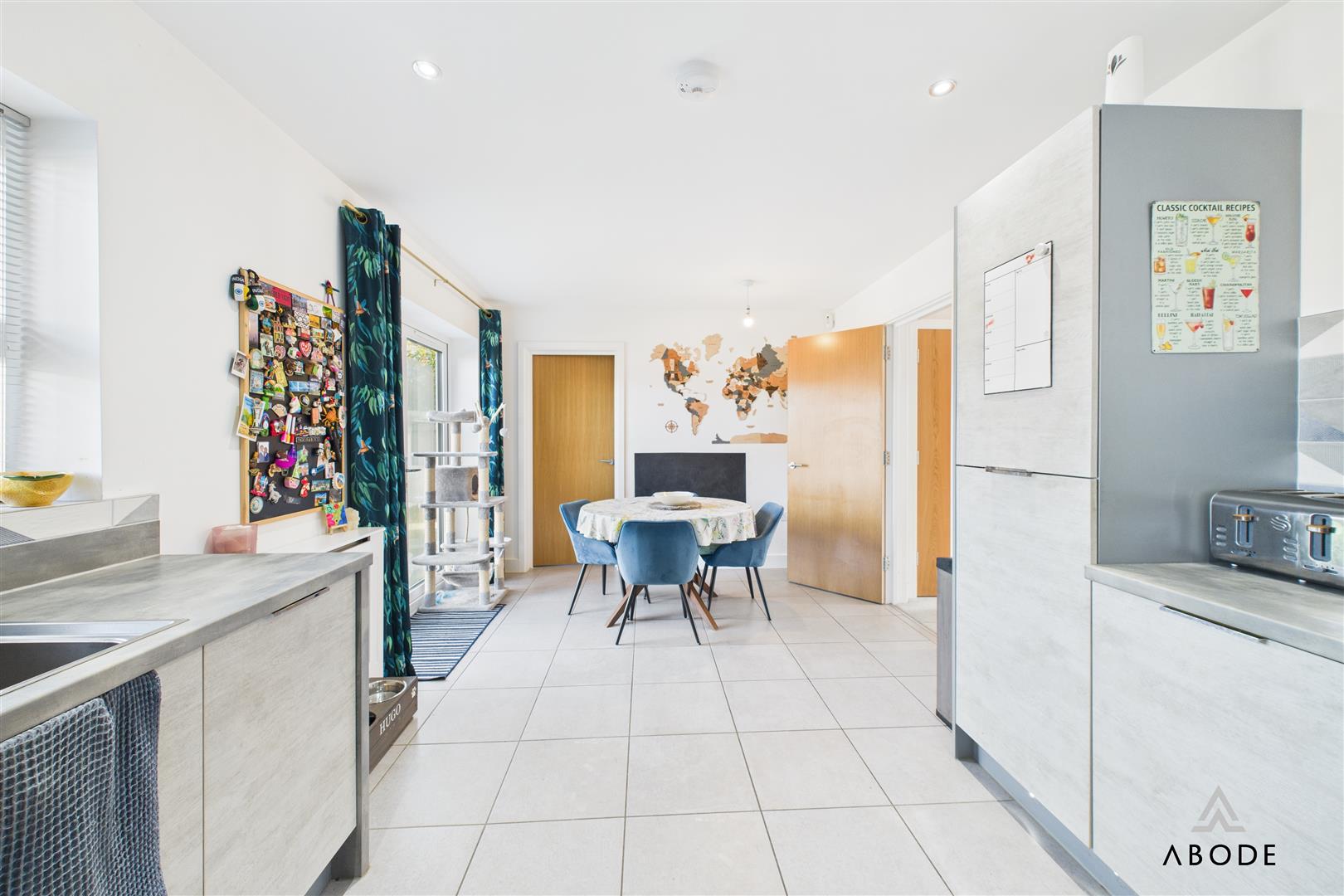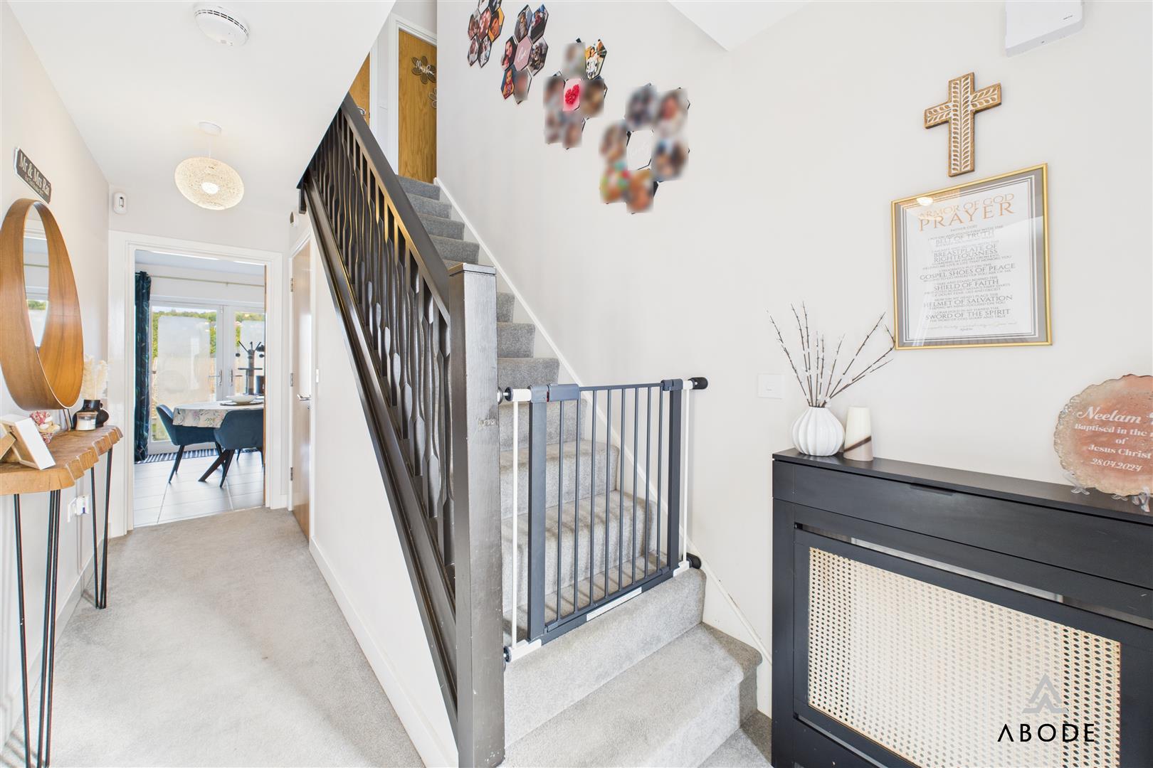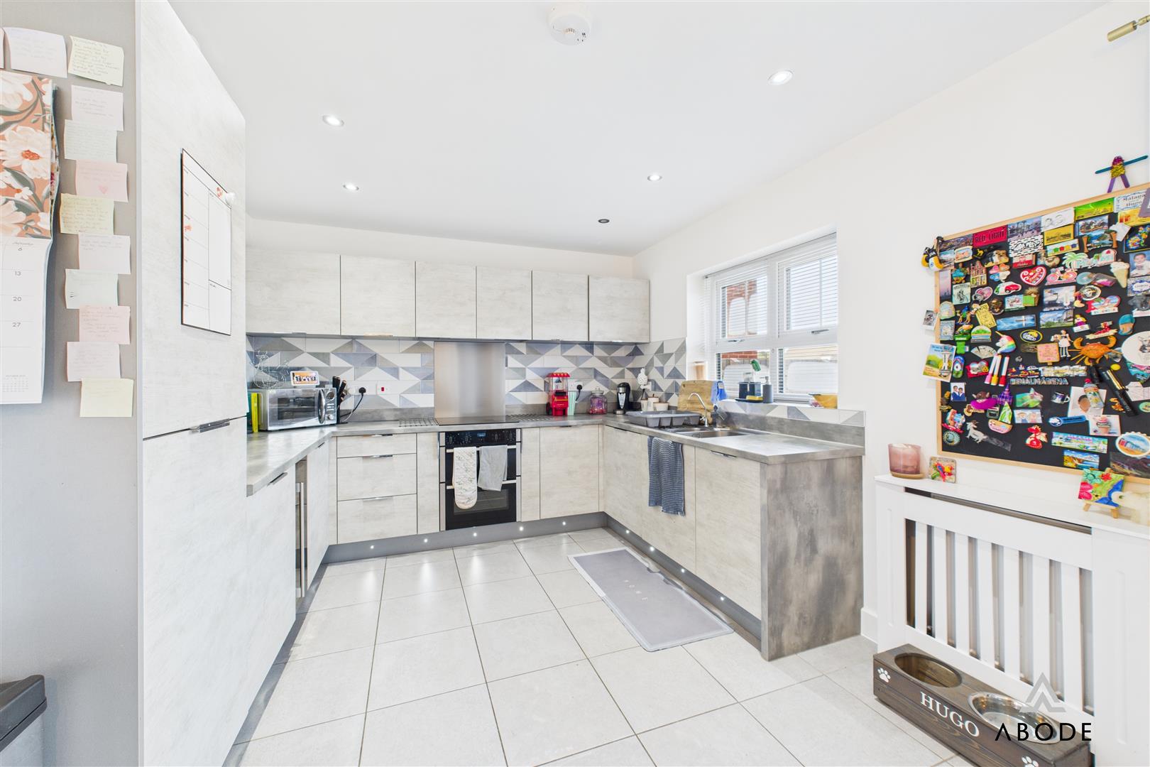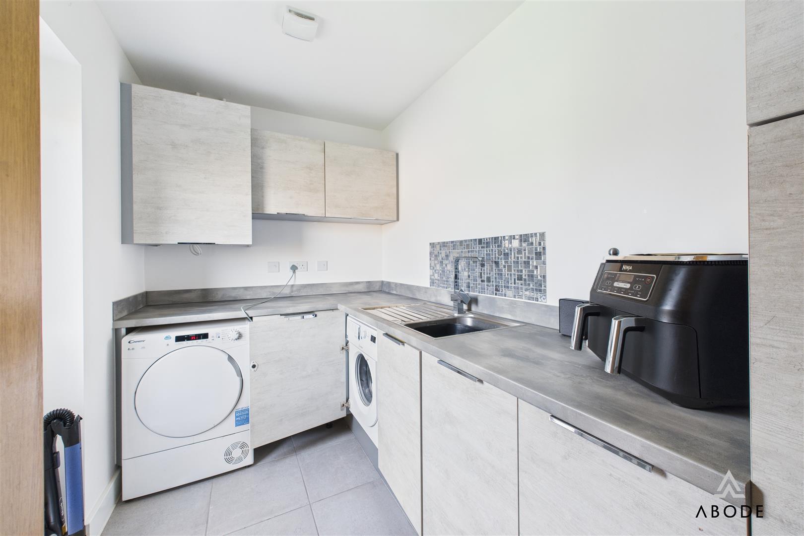 The accommodation begins with a welcoming entrance hallway that sets the tone for the quality found throughout. To the front, the living room is a bright and generous space, enhanced by a large window drawing in natural light. To the rear, the open-plan kitchen diner forms the heart of the home, fitted with high-specification appliances and a contemporary design. French doors open directly onto the garden, creating a seamless link between inside and out, while a separate utility room adds further practicality with its additional storage and garden access.