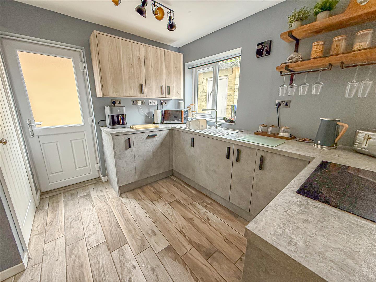 Fitted units with work surfaces and a breakfast bar, sink and drainer unit. Fitted oven and hob, integrated dishwasher, double glazed windows and doors onto the garden.