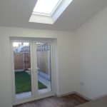 Fitted units with work surfaces and a breakfast bar. Fitted oven and hob, radiator, sky light window and double doors onto the garden.