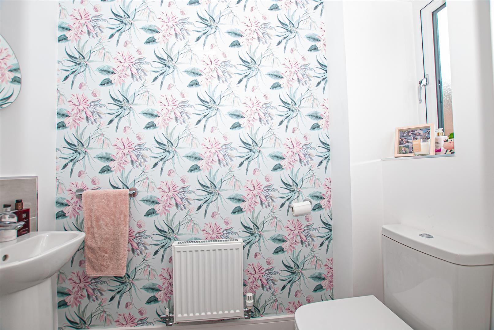 With a UPVC double glazed frosted glass window to the front elevation, low-level WC with Continental flush, pedestal wash hand basin with mixer tap and tiled splashback, central heating radiator and extractor fan.
