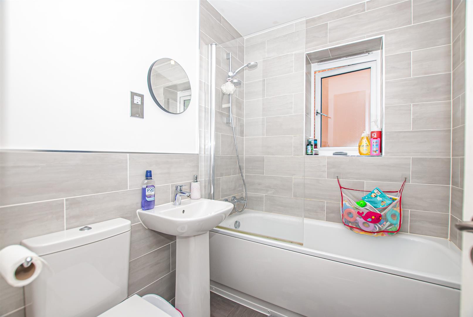 With a UPVC double glazed frosted glass window to the side elevation, featuring a three-piece bathroom suite comprising of low-level WC with Continental flush, pedestal wash basin with mixer tap, P shaped bath unit with shower over, glass screen and complementary tiling to wall coverings, heated towel radiator, extractor fan.
