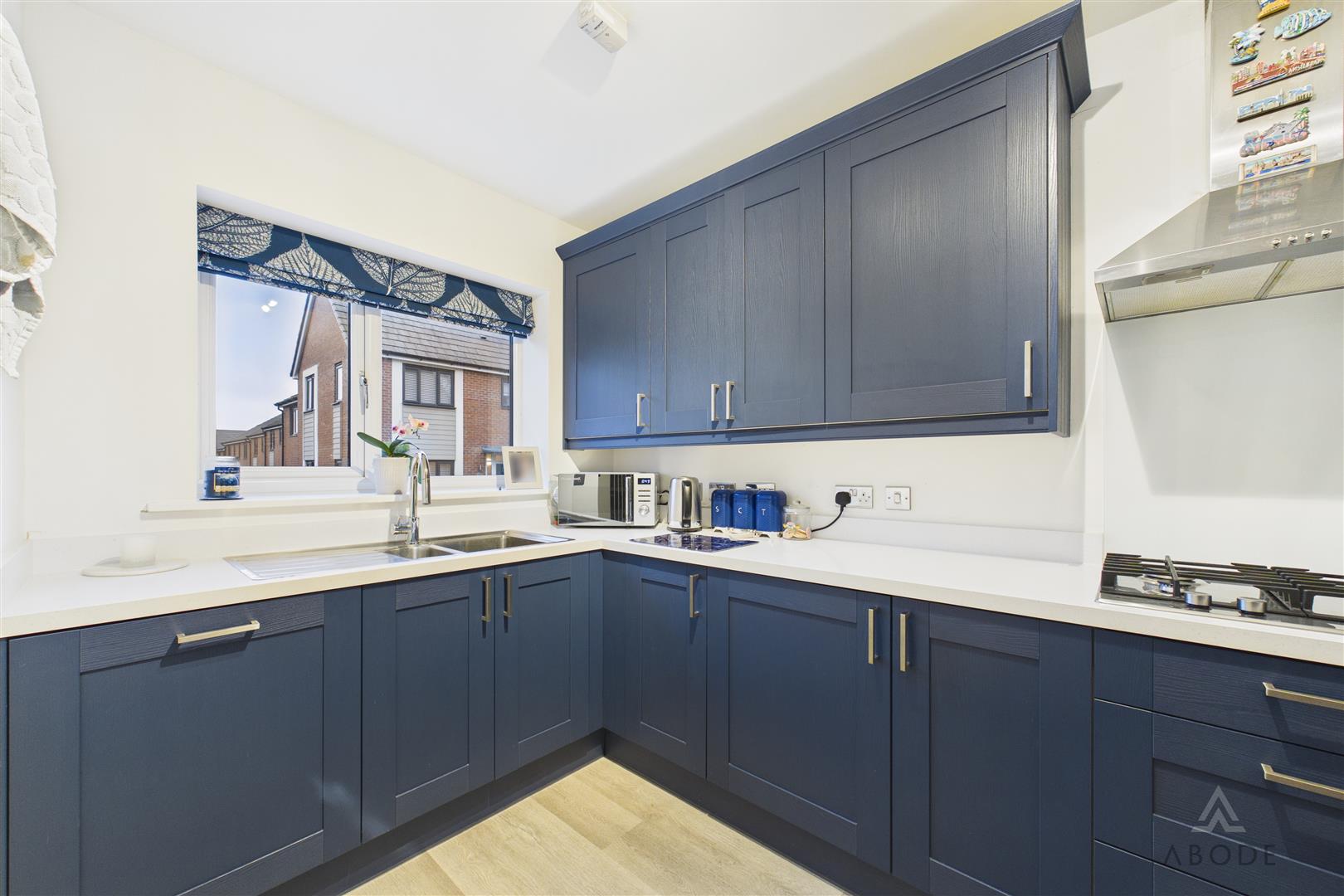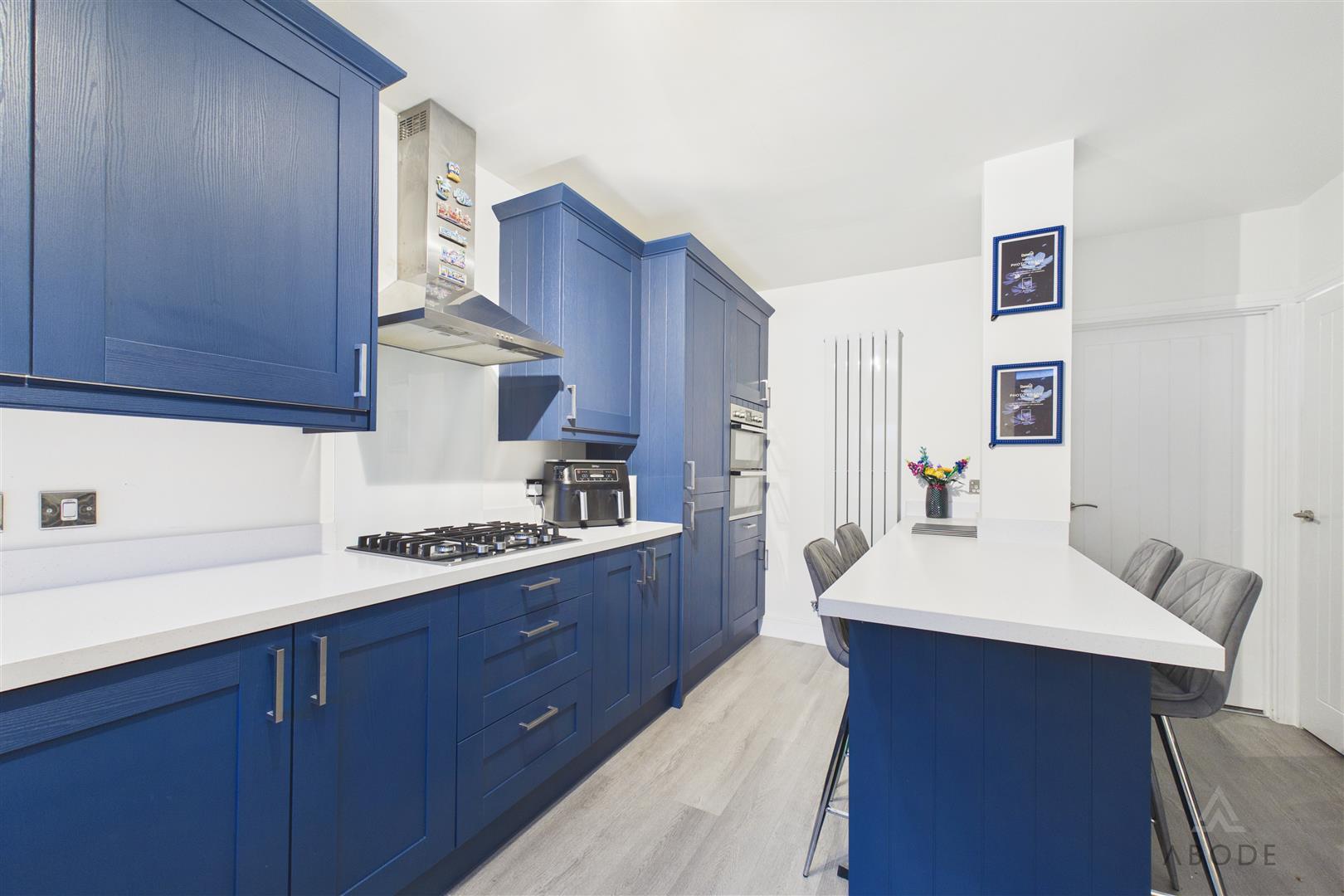 The kitchen benefits from a UPVC double-glazed window to the front elevation and features a range of matching base and eye-level storage cupboards and drawers with drop-edge preparation work surfaces. Integrated appliances include a 1½ stainless steel sink and drainer with mixer tap, a four-ring Zanussi stainless steel gas hob with matching extractor hood, and an oven/grill, with space for freestanding and under-counter white goods. A breakfast bar provides seating for up to four people. The kitchen was newly installed approximately one year ago.