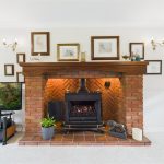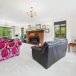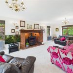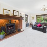 An elegant and airy lounge with three double-glazed windows and patio doors opening to the garden. Featuring a brick fireplace with a large cast coal-effect burner, a central heating radiator, and double doors leading to a separate formal dining room.