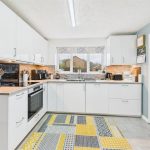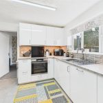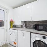 The modern kitchen is fitted with high-gloss cabinetry, complementary work surfaces, tiled splash backs, integrated appliances and space for further white goods. A door leads into the utility room, which provides additional storage, worktop space, plumbing for appliances and access to the rear garden.