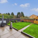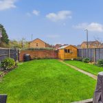 The rear garden is well cared for, offering a sizeable lawn, planted borders and a full-width patio providing a superb space for outdoor seating and dining. A timber shed provides useful external storage, and the garden is enclosed for privacy.