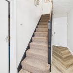 The property is entered via a front entrance door into a welcoming hallway with wood-effect flooring, stairs rising to the first floor, and doors leading to all ground-floor rooms.