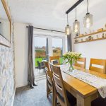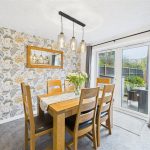 The lounge sits to the front elevation and features a bay window that provides an excellent amount of natural light, a central fireplace, and generous floor space for family seating. An opening leads into the dining room, which enjoys views across the rear garden and has French doors opening onto the patio — ideal for both everyday dining and entertaining.