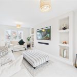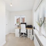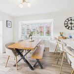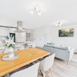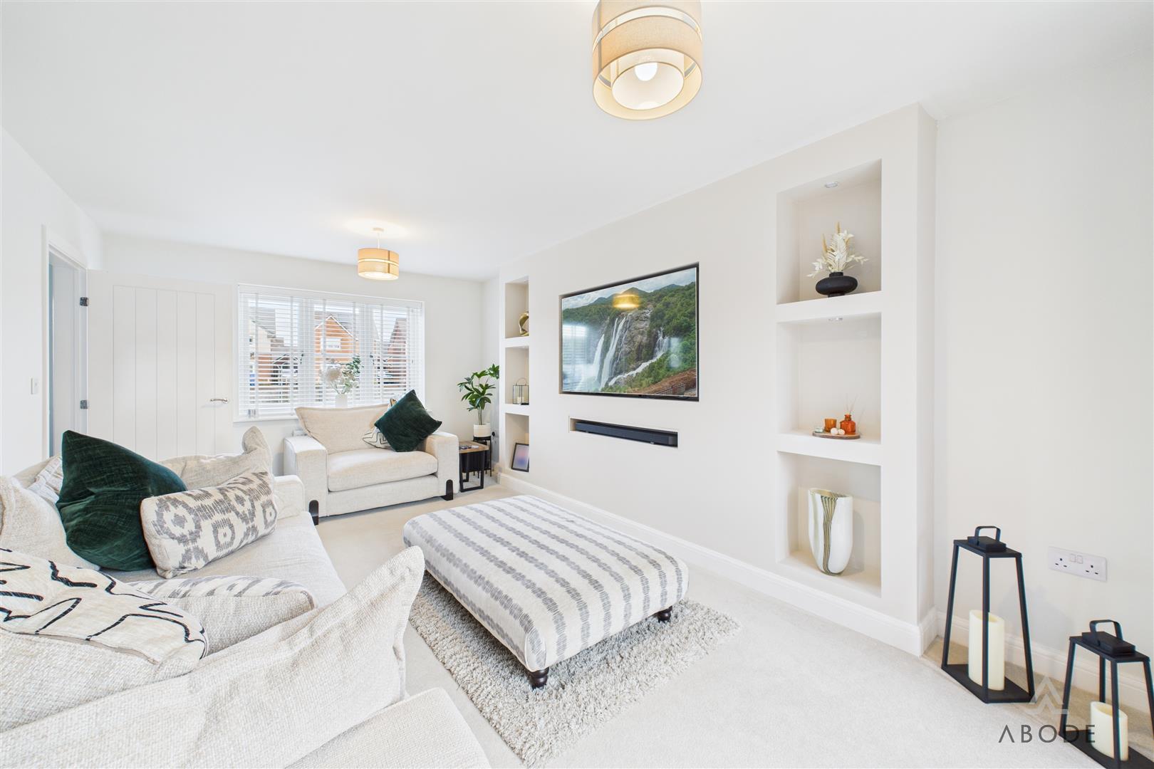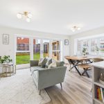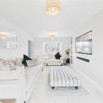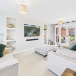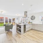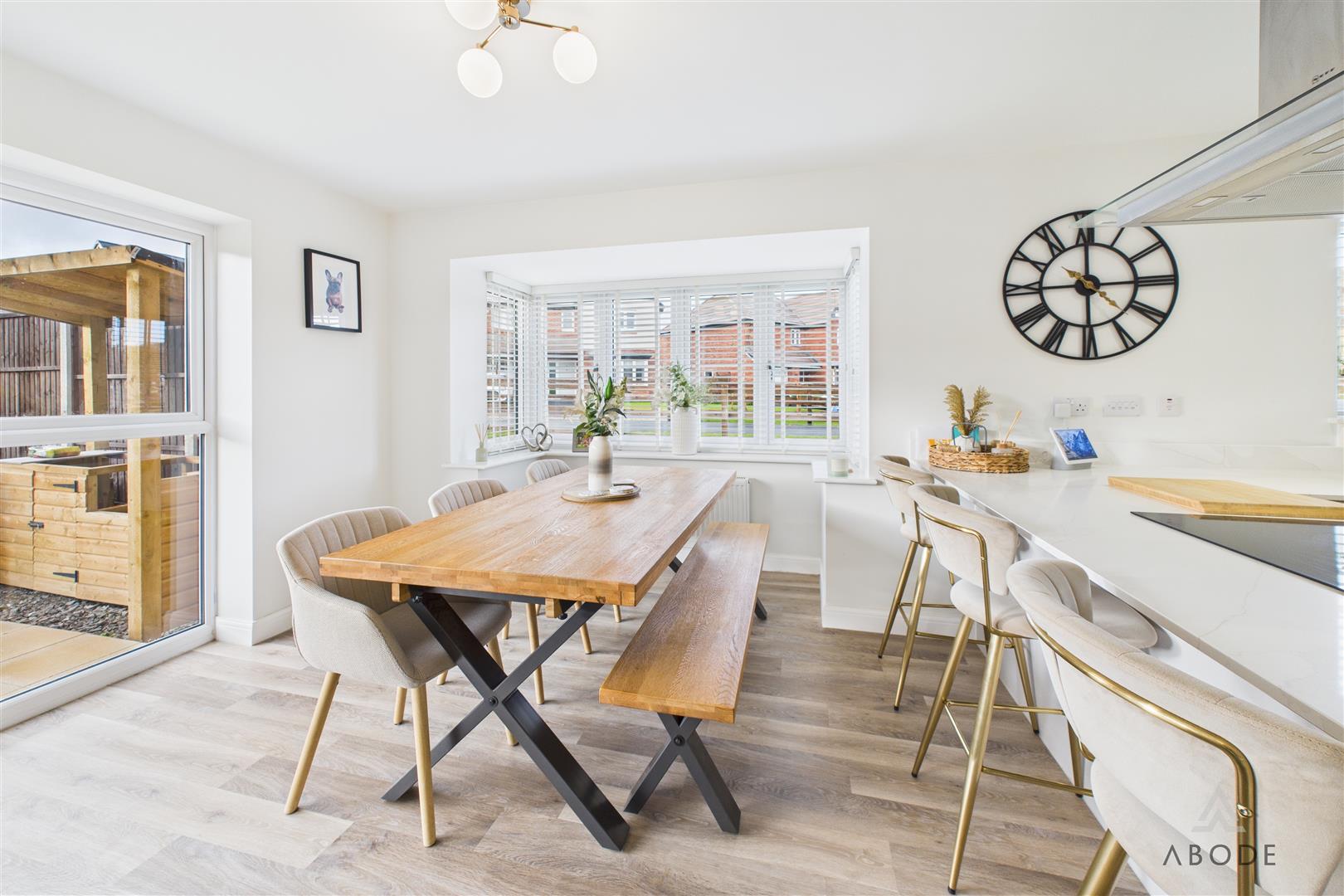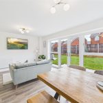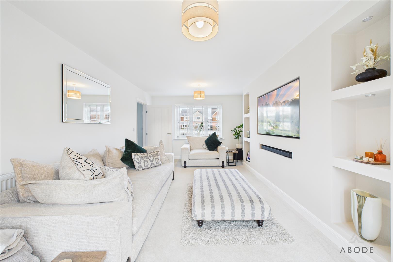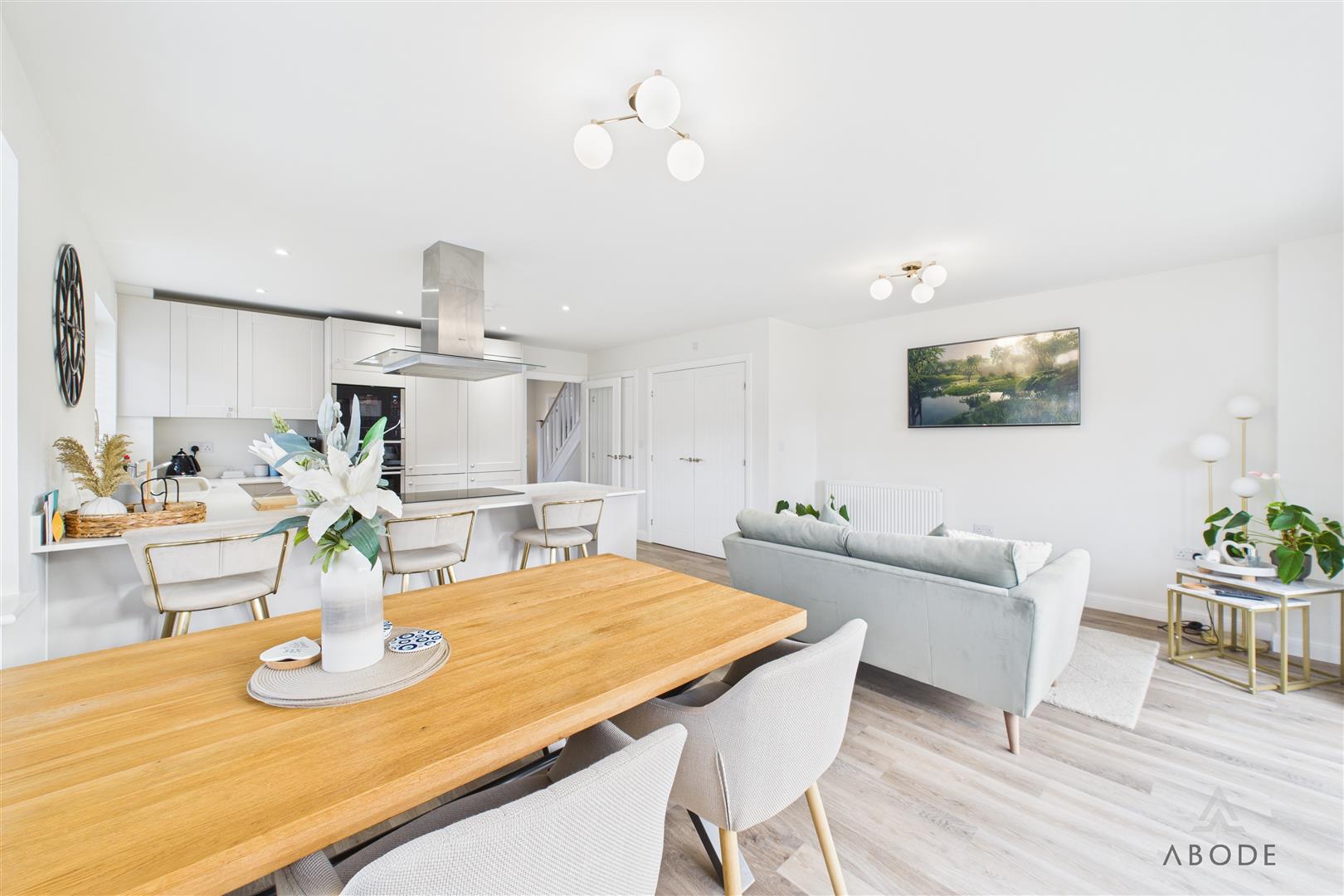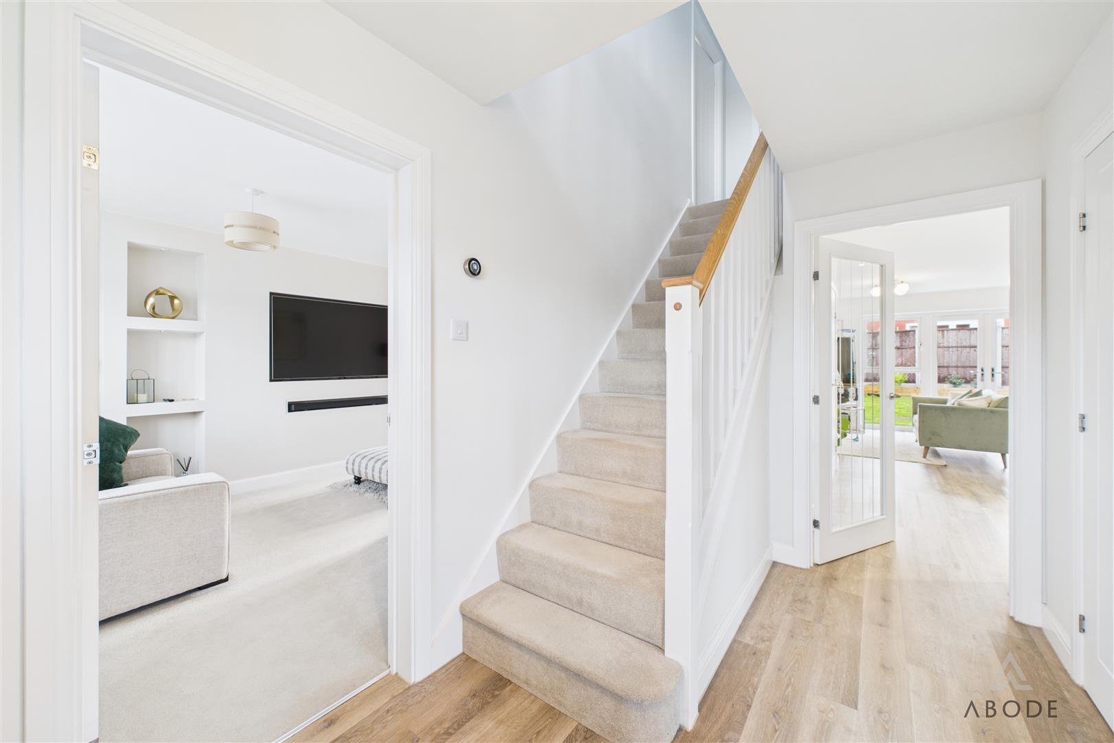 A panelled glazed entrance door opens into a welcoming entrance hallway with quality flooring, central heating radiator, and staircase rising to the first floor. From here, access is provided to a stylish fitted guest cloakroom and a generous dual-aspect living room, which enjoys a bright and airy feel thanks to a front-facing window and French doors opening onto the rear garden. The living room features an impressive media wall, creating a strong focal point for the space. A separate study provides an ideal home-working environment or additional reception room, benefitting from dual-aspect windows and useful built-in storage. To the rear of the property lies the standout open-plan kitchen, dining and family living space, designed perfectly for entertaining and everyday family life, incorporating a comfortable seating area and dining space with French doors and a feature box bay window overlooking the garden. The high-specification kitchen is fitted with shaker-style cabinetry, quartz work surfaces, and a comprehensive range of integrated appliances, including double oven, microwave, induction hob, fridge freezer, dishwasher, and wine fridge, all finished to an excellent standard, with a utility area providing additional storage and appliance space.