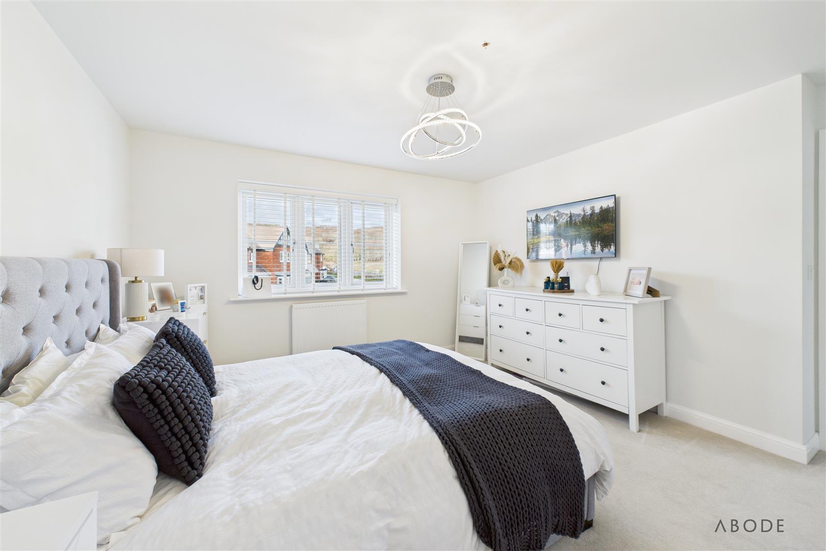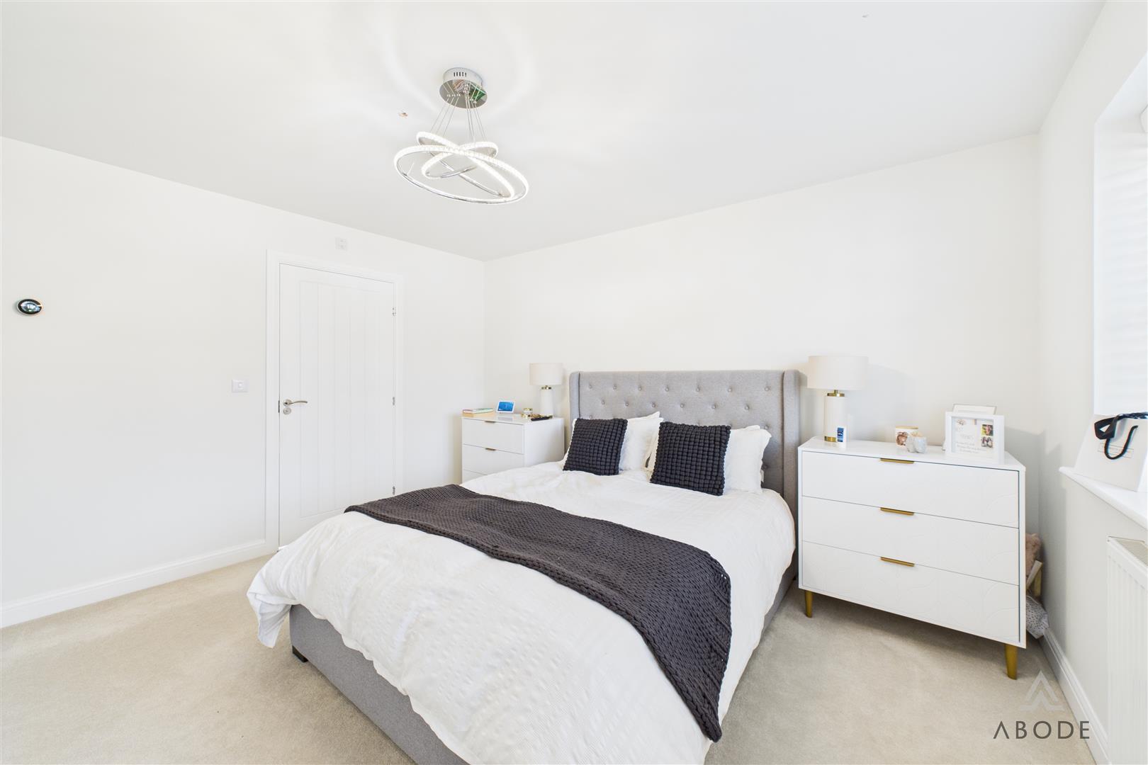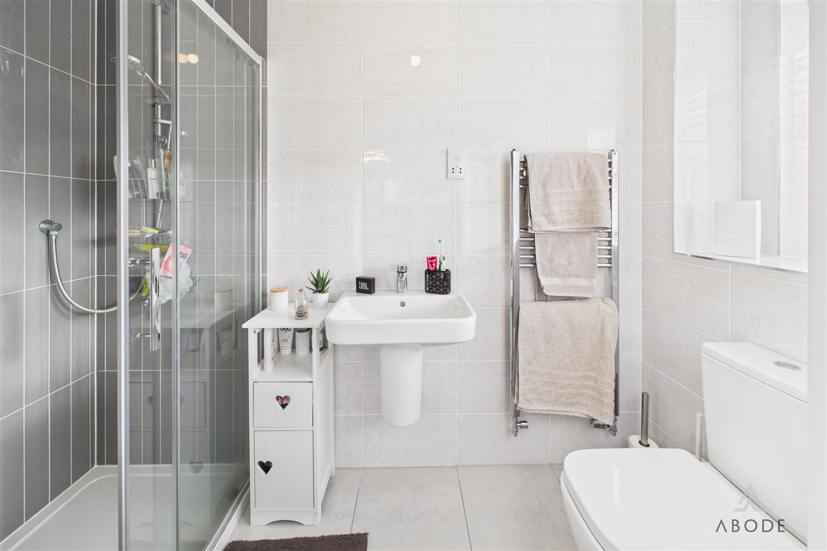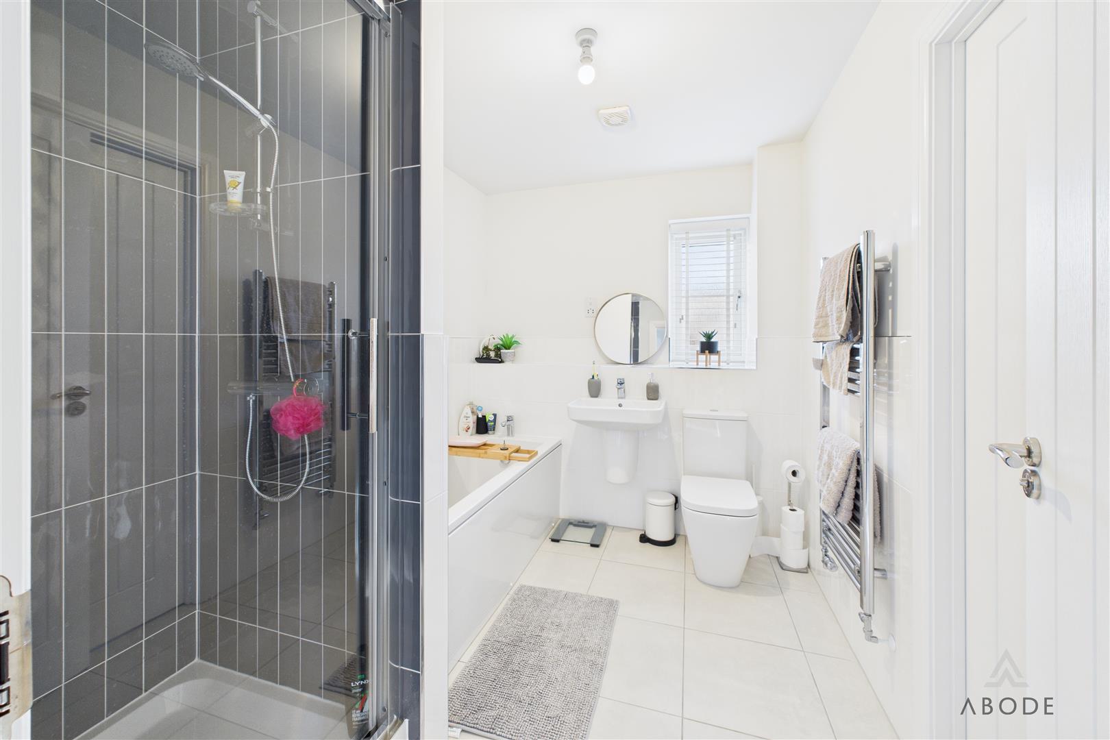To the first floor, the accommodation is arranged around a semi-galleried landing with modern balustrade, airing cupboard, and window providing natural light. The principal bedroom is a well-proportioned double room and benefits from a superbly appointed en-suite shower room with contemporary sanitary ware, fully tiled walls and floor, chrome towel rail, and window for ventilation. Three further good-sized bedrooms complete the sleeping accommodation, offering flexibility for family use, guests, or dressing rooms, and are served by a well-appointed family bathroom fitted with a modern white suite including both a bath and separate shower.