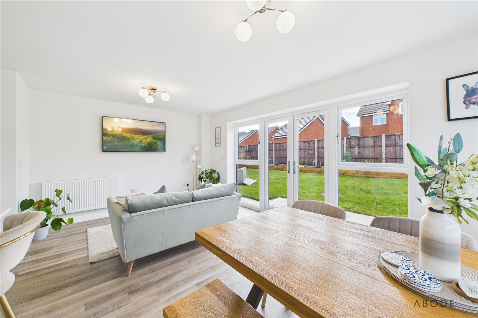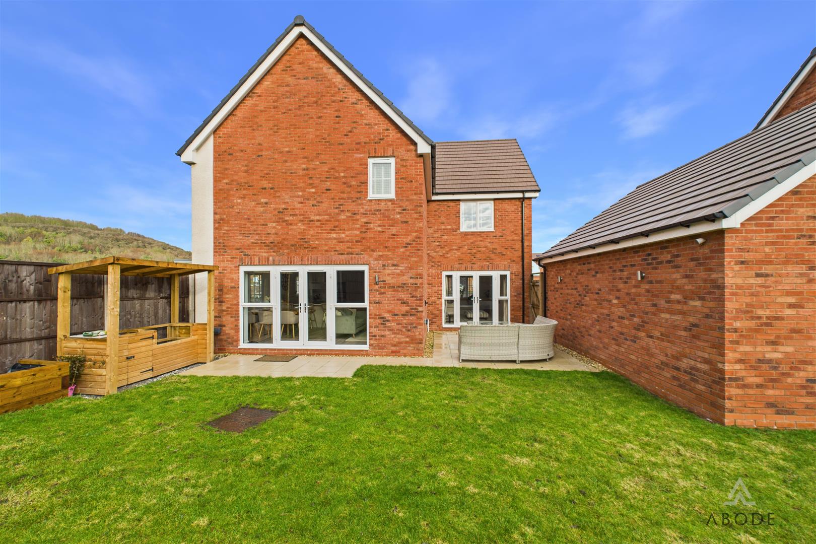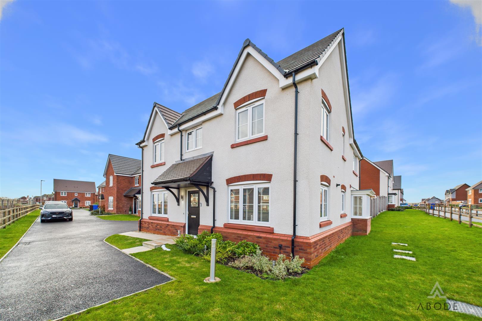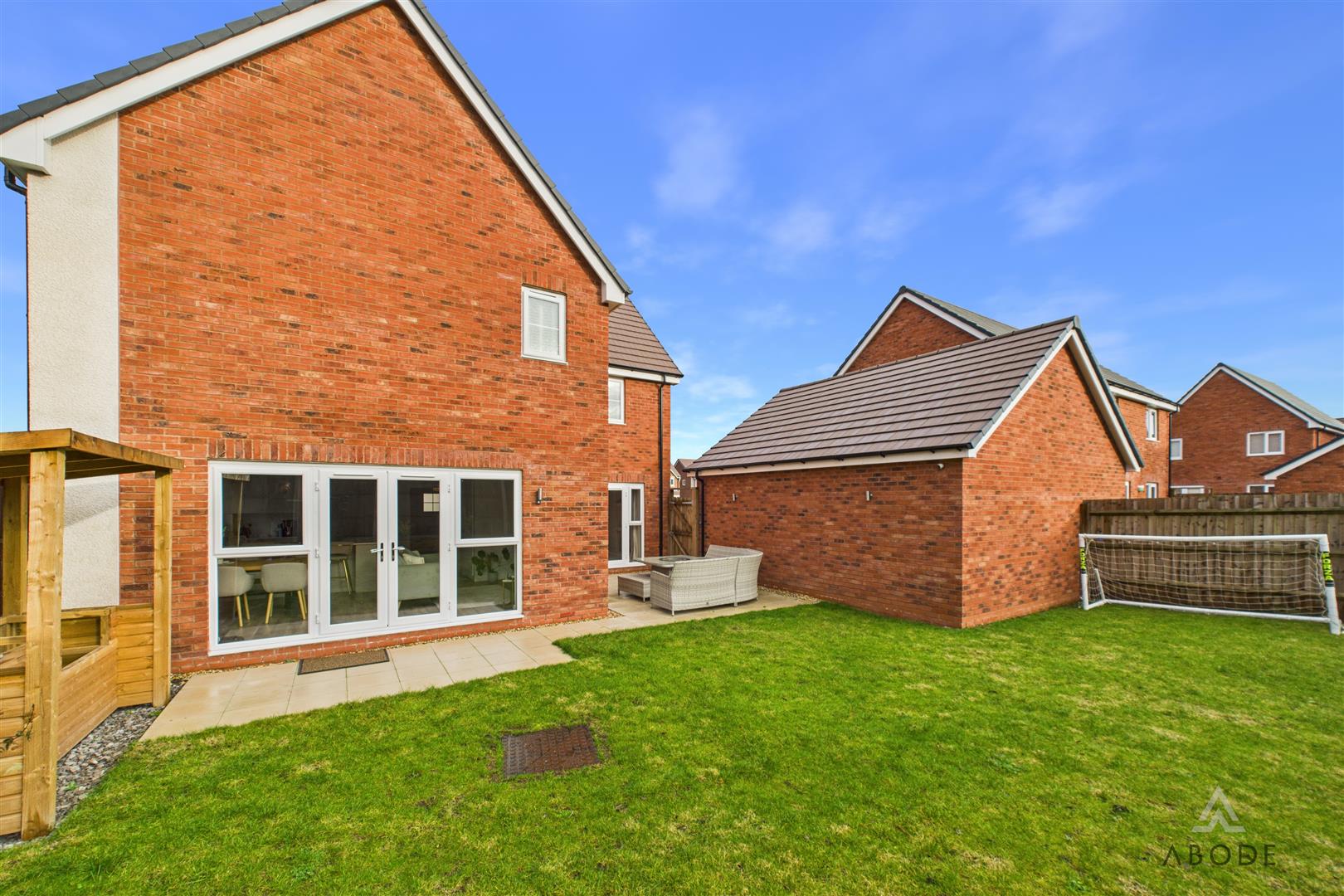 Externally, the property enjoys a particularly enviable position with no through traffic and open green space nearby. To the front is a double-width driveway providing excellent parking, along with further car standing space and access to the detached double garage. The rear garden is fully enclosed and enjoys a desirable south-west facing aspect, making it ideal for afternoon and evening sun. The garden has been thoughtfully landscaped to include an extended patio terrace ideal for outdoor dining, a well-maintained lawn, sleeper-edged borders stocked with plants and shrubs, and timber fencing, with the addition of external lighting, power supply, and a water tap.