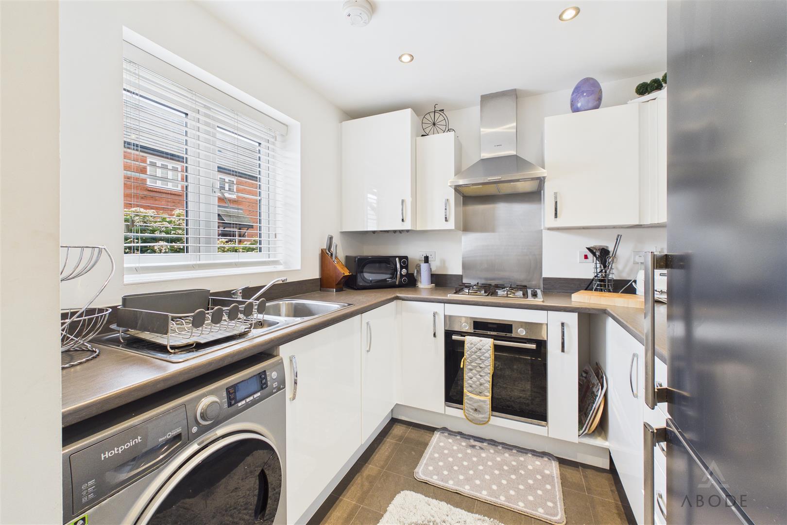 The kitchen is fitted with a range of modern wall and base units with complementary work surfaces over, incorporating a stainless steel sink and drainer, integrated oven with gas hob and extractor above, and space and plumbing for further appliances. A window to the front elevation allows for plenty of natural light.