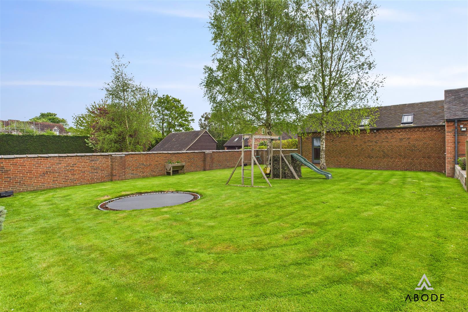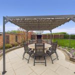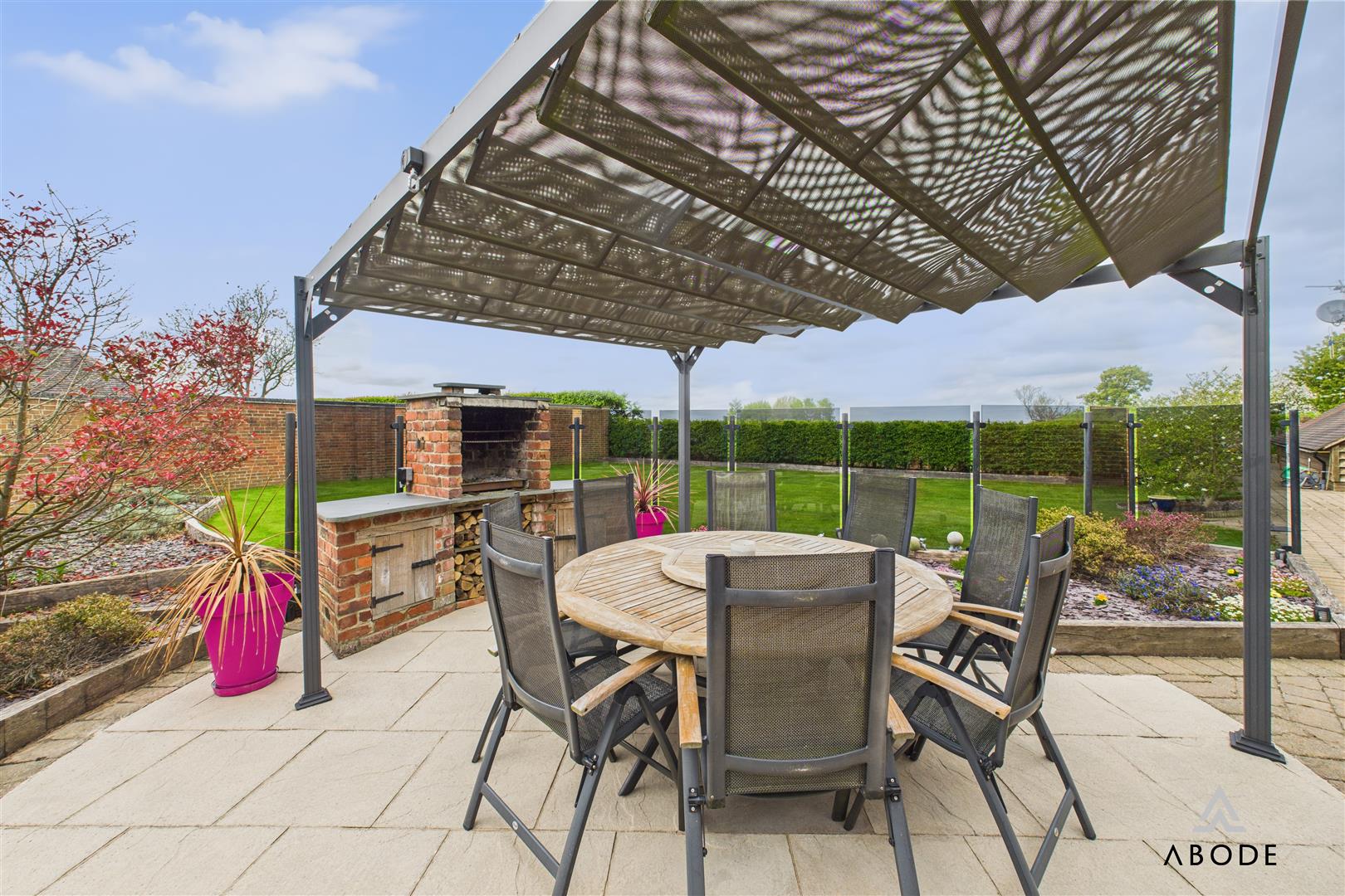 Externally, the extensive gardens create a wonderful family setting, featuring a stylish entertaining terrace with contemporary glazed panels, a pergola overhead, and a built-in brick barbecue — perfect for summer evenings.