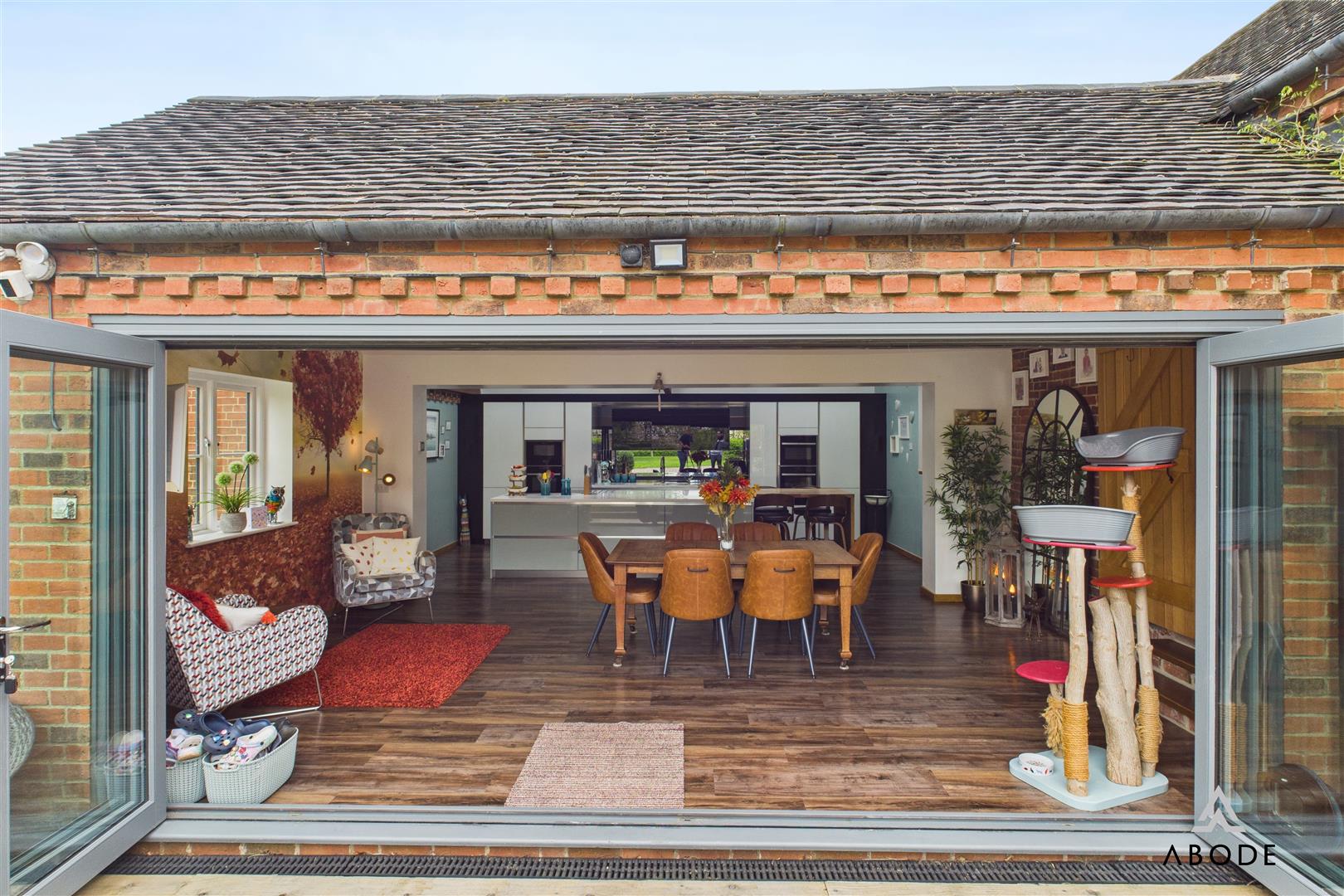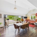 The open-plan dining and living areas are flooded with natural light thanks to wide bi-fold doors opening directly onto the garden — creating the perfect indoor-outdoor entertaining space.