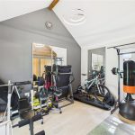 From the kitchen, a hallway leads to a useful utility room, a luxury bathroom, and a versatile room currently used as a gym.