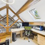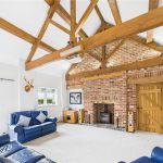 The principal living room is a particularly striking space, featuring a vaulted ceiling with exposed beams, a brick-built fireplace housing a wood-burning stove, and an eye-catching staircase leading to a mezzanine-level home office or den that overlooks the room below.
