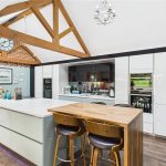 At the heart of the home lies an outstanding extended kitchen/dining/living area, designed with sophistication, practicality, and luxury in mind. The bespoke kitchen features sleek high-gloss cabinetry, seamless Corian work surfaces, and a handcrafted Tiger wood breakfast bar, creating a stunning focal point for everyday living and entertaining.