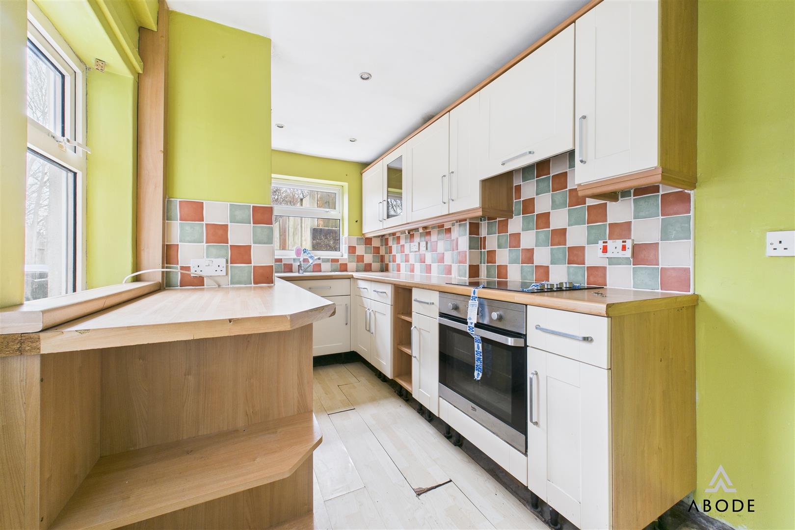 Fitted wall mounted, base and drawer units with works surfaces and a sink drainer unit. Space for a fridge freezer, fitted oven and hob, plumbing and space for a washing machine, window to the rear and a door to the side.
