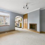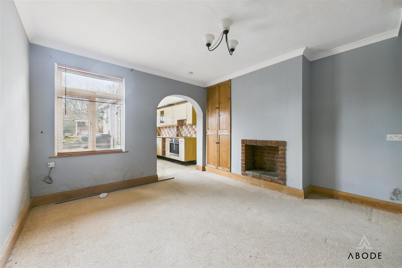 Entrance door into the lounge with feature log burner, upvc double glazed window to the front and a radiator.