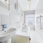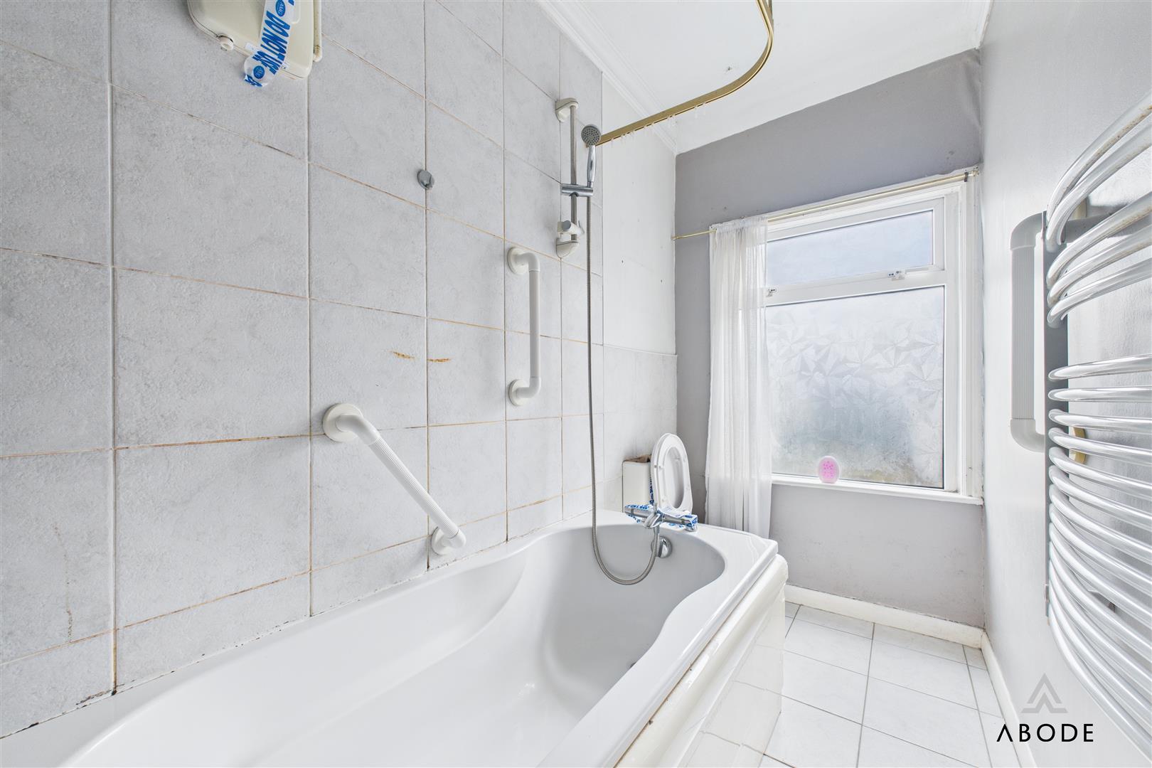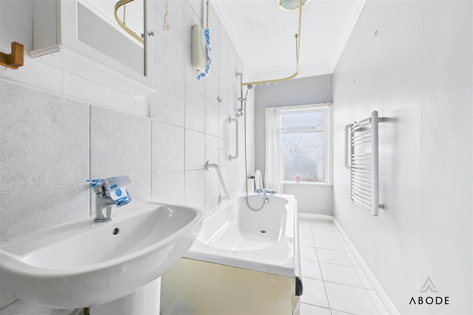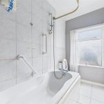 Panel enclosed bath with a shower over, wash hand basin, low flush wc, radiator and upvc double glazed window.