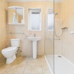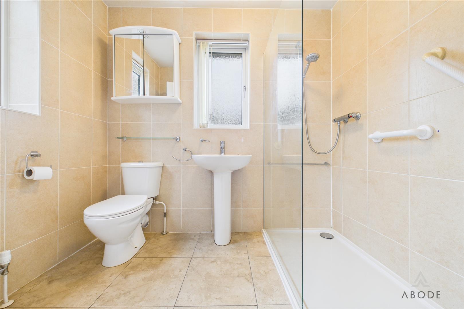 Walk in shower cubicle with glass screen, WC and wash hand basin. Central heating radiator, tiled flooring and walls, double glazed windows to the side and rear elevations, glass shelving and mirrored medicine cabinet.