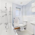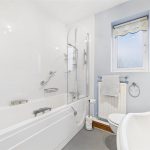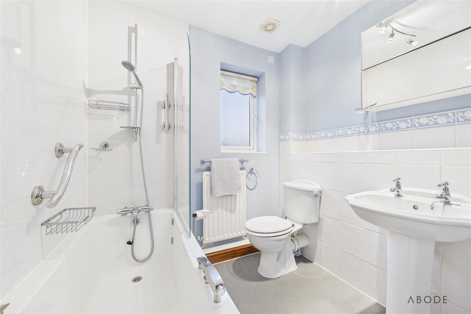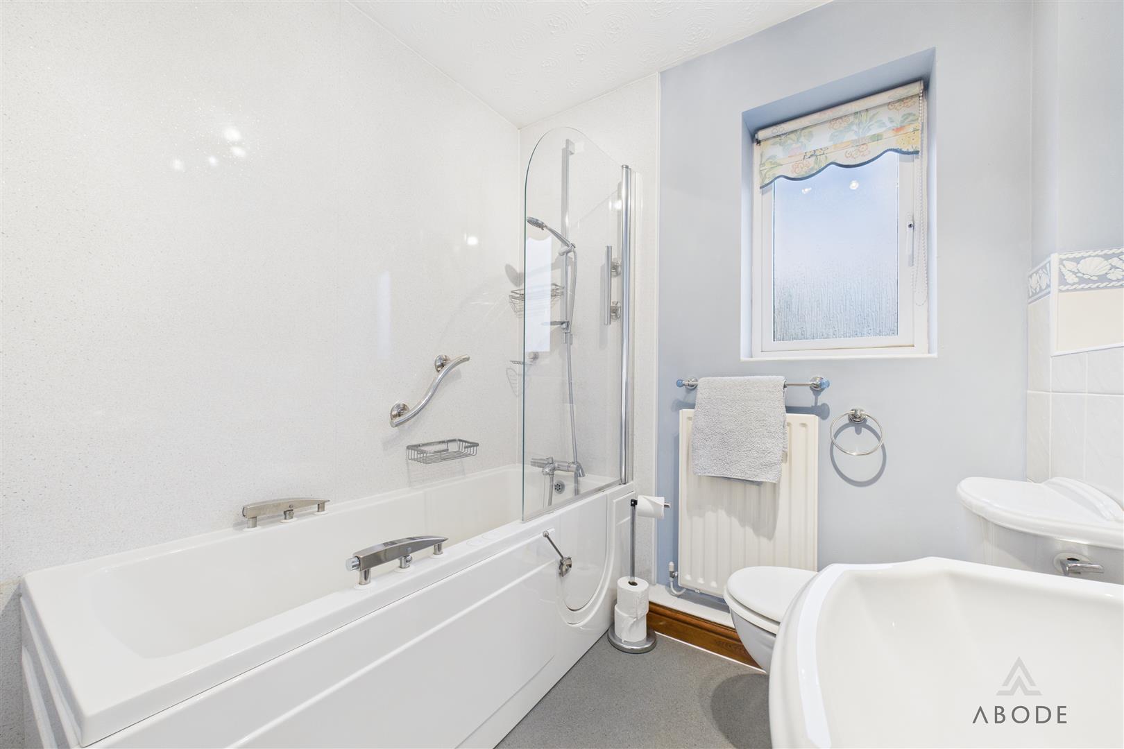 Fitted with a three-piece suite comprising a panelled bath with screen and shower over, low-level WC, and wash hand basin. A radiator and UPVC double glazed window to the rear elevation are also included.