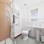 Fitted with a three-piece white suite comprising a low-level WC, pedestal wash hand basin, and corner shower unit. A radiator and UPVC double glazed window to the side elevation complete the room.