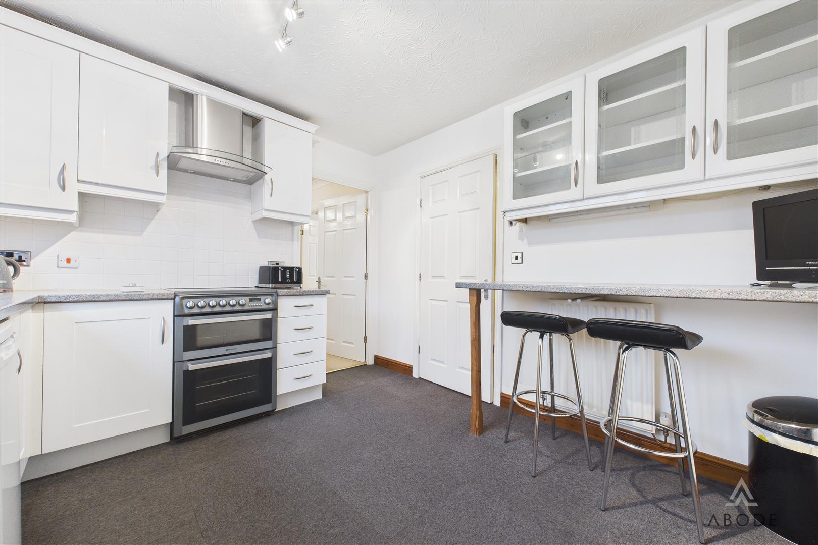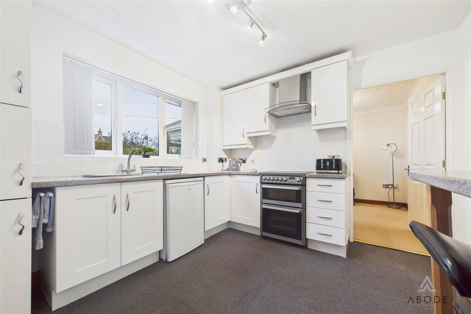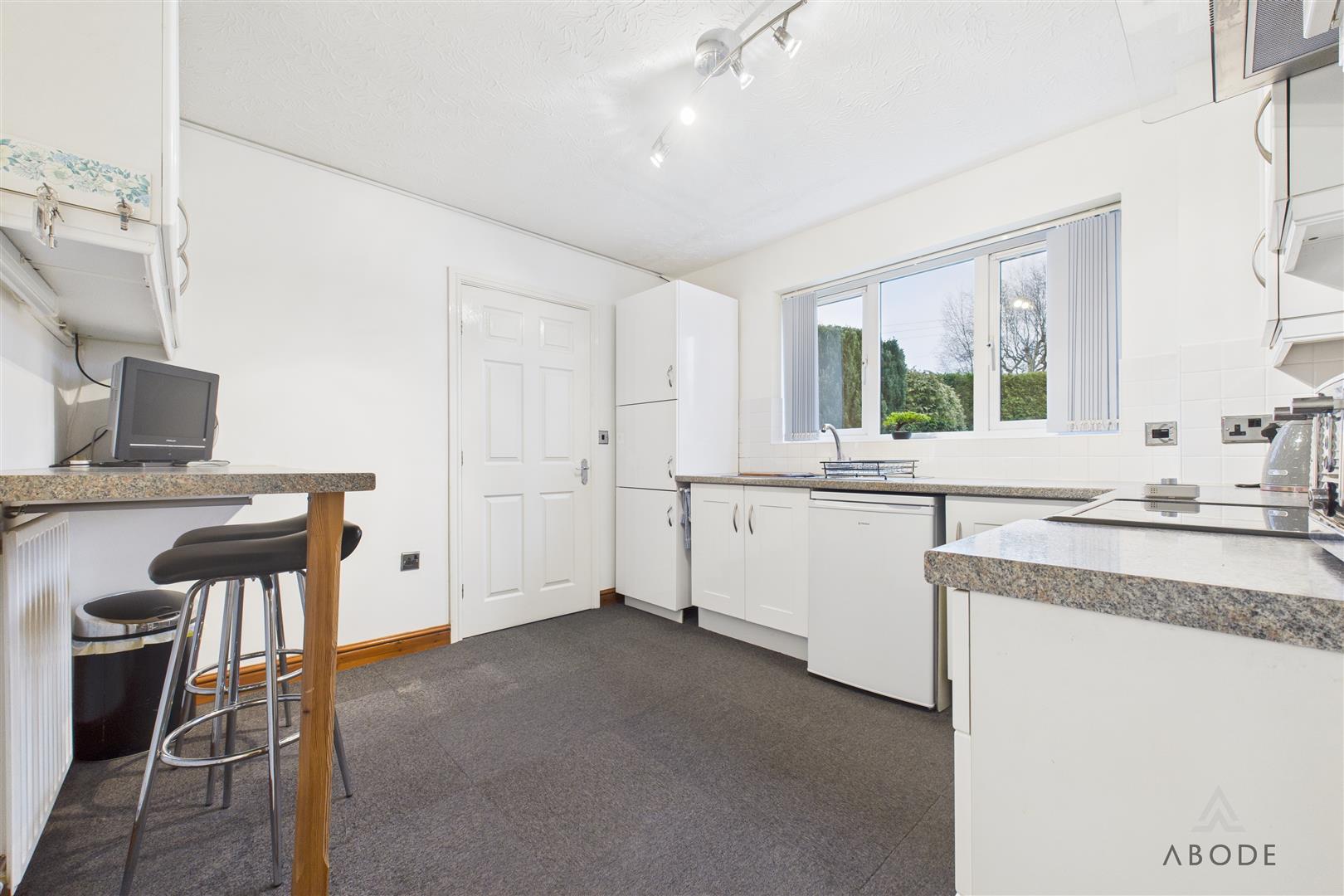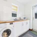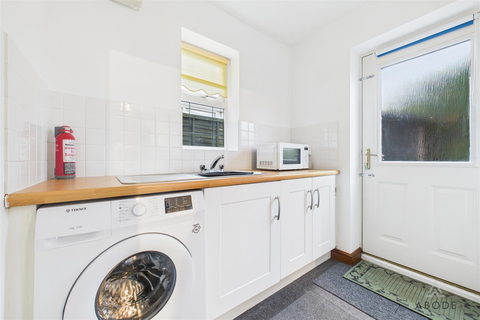 Located to the rear, the utility room is fitted with additional base units, a stainless steel sink with drainer, plumbing and appliance space for a washing machine, and a window to the side elevation.