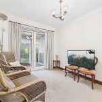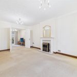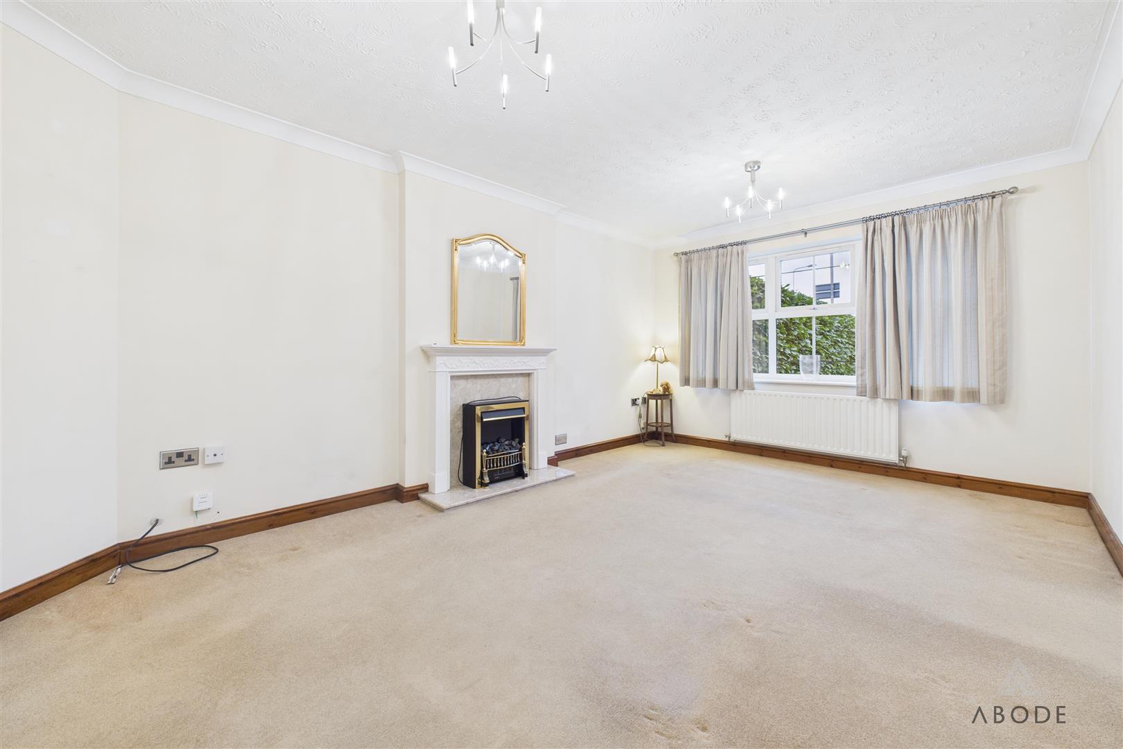 A spacious living room featuring a UPVC double glazed window to the front elevation. The focal point of the room is the coal-effect electric fire, set within an Adam-style fire surround with marble backing and hearth. The room is further complemented by two radiators and double doors leading to the dining room.