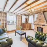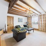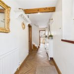 Stepping into the hallway, the period features make an immediate impression with exposed timber beams and detailed window sills. To the left, the first reception room offers a welcoming living space, complete with a feature fireplace, ornate windows, and exposed beams, creating a warm and inviting atmosphere.