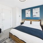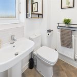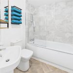 Panel enclosed bath with an electric shower and shower screen, low flush WC, wash hand basin, radiator.