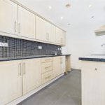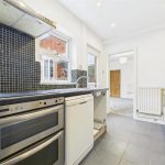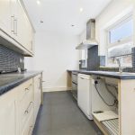 This well-appointed kitchen offers two UPVC double glazed windows to the side elevation and a UPVC double glazed door opening out to the rear patio. The kitchen is fitted with a range of matching base and eye-level storage cupboards and drawers, complemented by roll-top granite-effect work surfaces and tiled splashbacks. Integrated appliances include a four-ring hob with stainless steel extractor hood, oven and grill, and a one-and-a-half bowl stainless steel sink and drainer with mixer tap. There is plumbing and space for under-counter white goods, tiled flooring throughout, a central heating radiator, and ceiling spotlights providing a bright, modern finish.