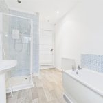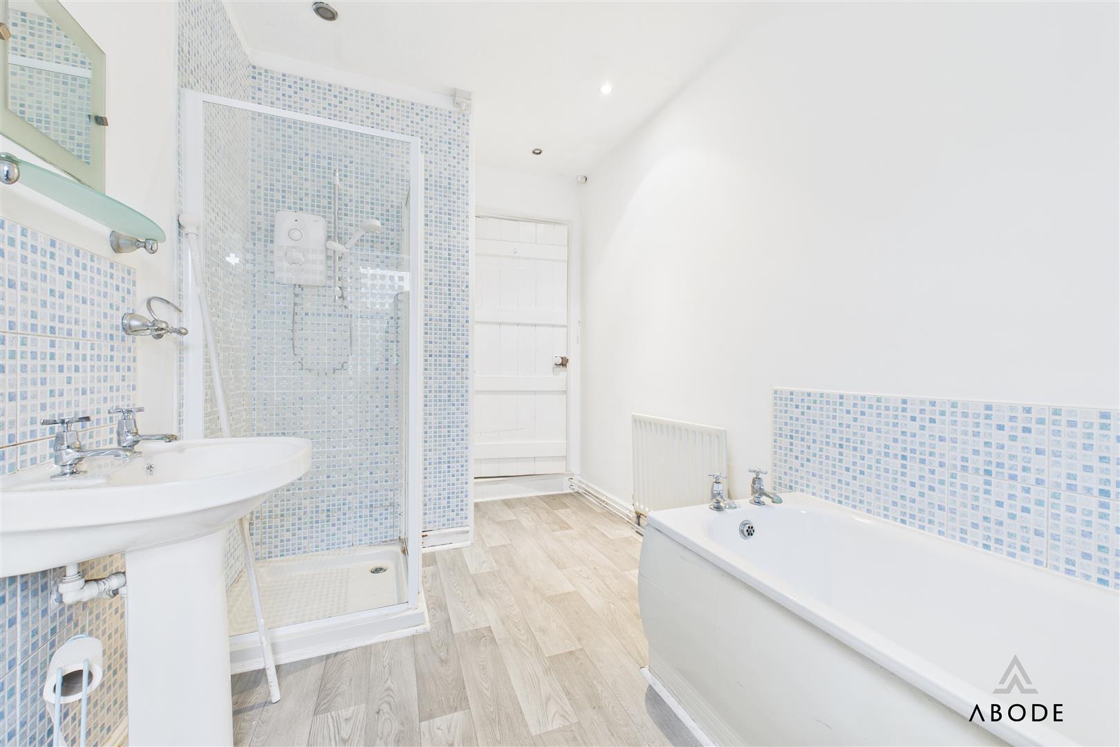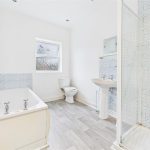 A generous four-piece bathroom suite comprising a low-level WC, panelled bath, pedestal wash hand basin with tiled splashback, and a shower cubicle with electric shower. The room also includes a UPVC double glazed frosted window to the rear elevation, central heating radiator, extractor fan, ceiling spotlights, and an airing cupboard housing the gas central heating boiler.