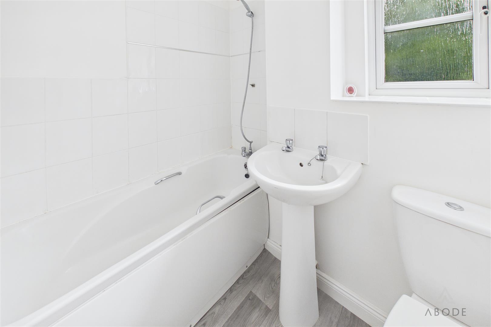 Panel enclosed bath, wash hand basin, low flush wc, upvc double glazed window and a radiator.