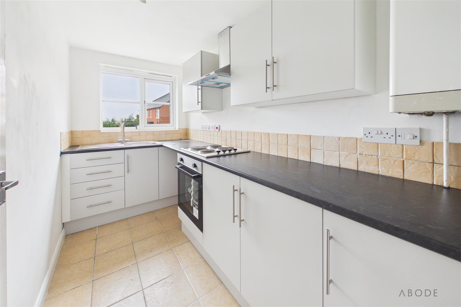 Fitted wall mounted, base and drawer units with for surfaces and a sink and drainer unit. New fitted electric oven and hob with extractor hood, Spaces for appliances, radiator, wall mounted gas boiler and upvc double glazed window.